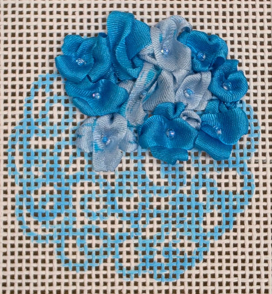 There are 9 different ribbons, 13 threads, and 10 bags of beads in the kit! The canvas is partially pre-painted by Tamara.