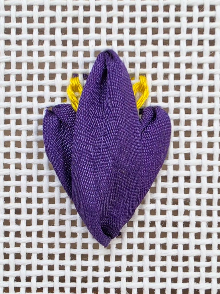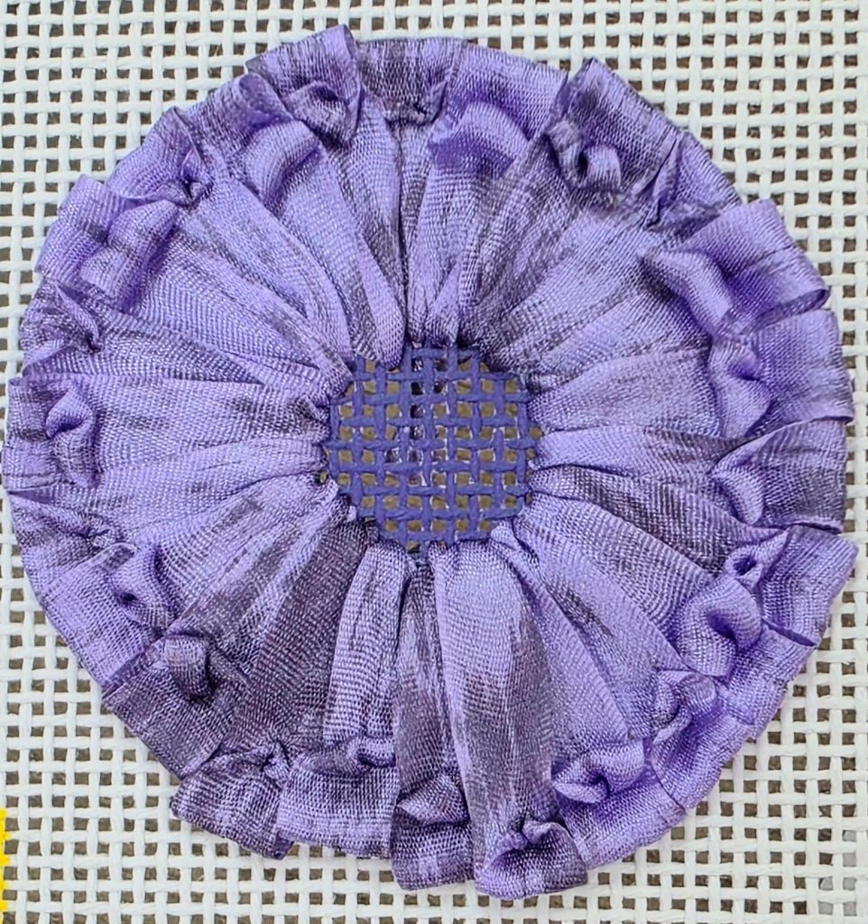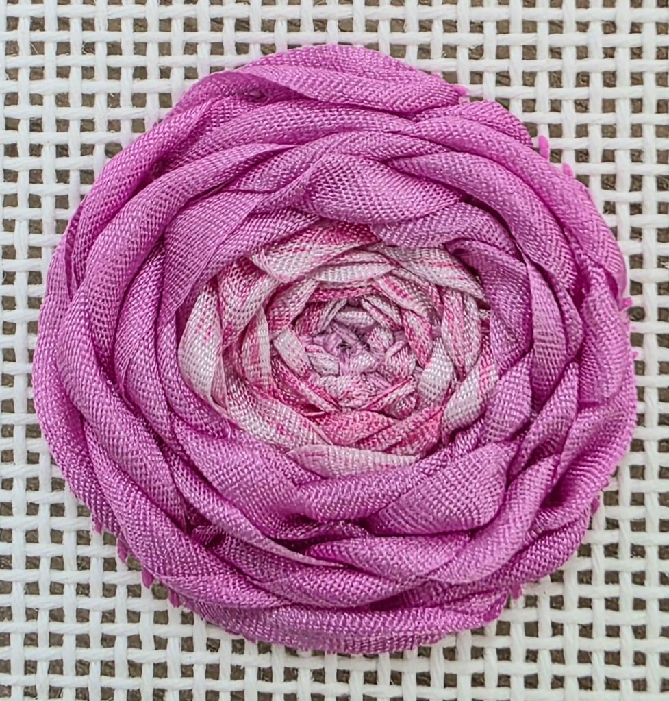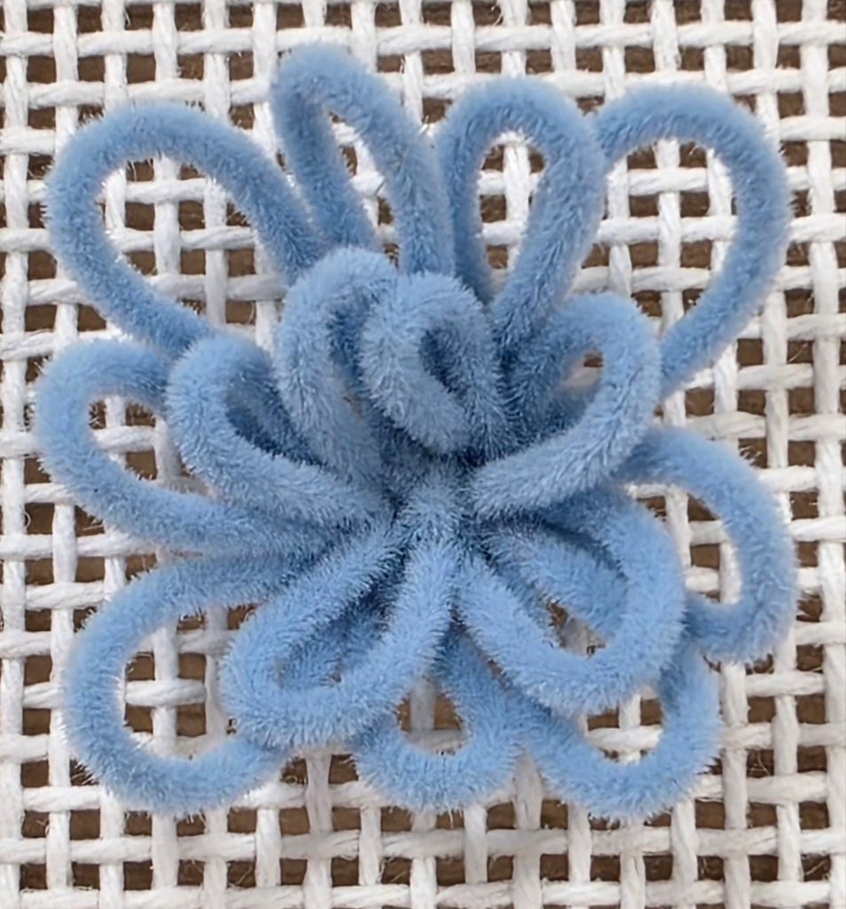 The Velvet Loop Flower done with Very Velvet was an extra flower I squeezed onto my canvas. Some stitches repeat in each of the 3 designs but in differ in color. This flower is not in mine but she taught it to all of us. I may add beads or a sequin.