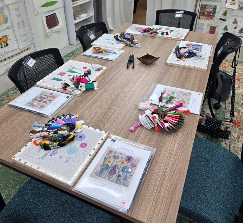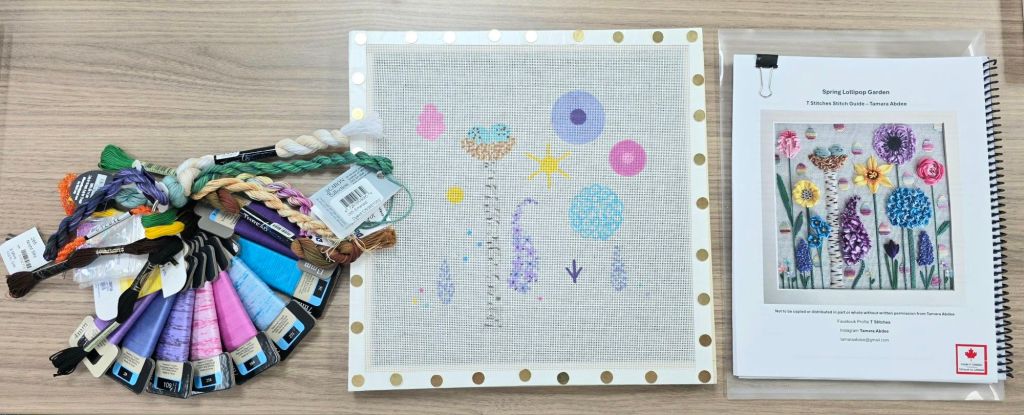 What a lovely display by Tamara Abdee as we walked into the classroom area at Fireside Stitchery. There were 2 tables all ready for us. I signed up for Spring Lollipop Garden. But, Tamara is teaching 3 different designs for 12 people. She filled two 2-day classes. Four other members from our ANG Main Line Stitchers Chapter are there including Lynn (and store owner), Kathy P, Pat K, and Karen P. I think we’ll be getting a new chapter member too!