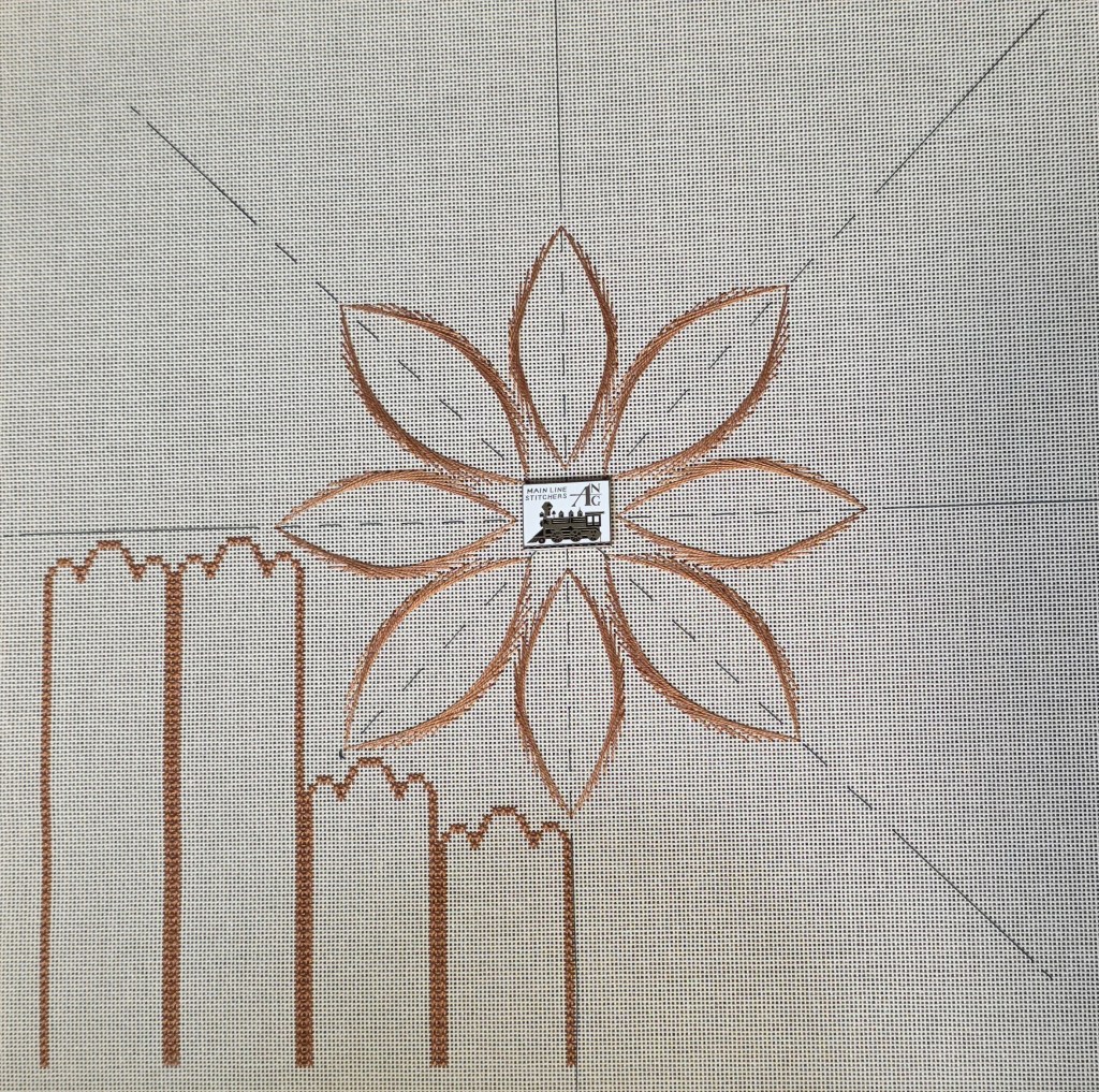 Linda M got us started on Razzle Dazzle by Ann Strite-Kurz at our March ANG Main Line Stitchers chapter meeting. It’s a large piece. The canvas is 18″ square. As you can see, I am working in the well because the design goes too close to the bars which makes ending threads more difficult.