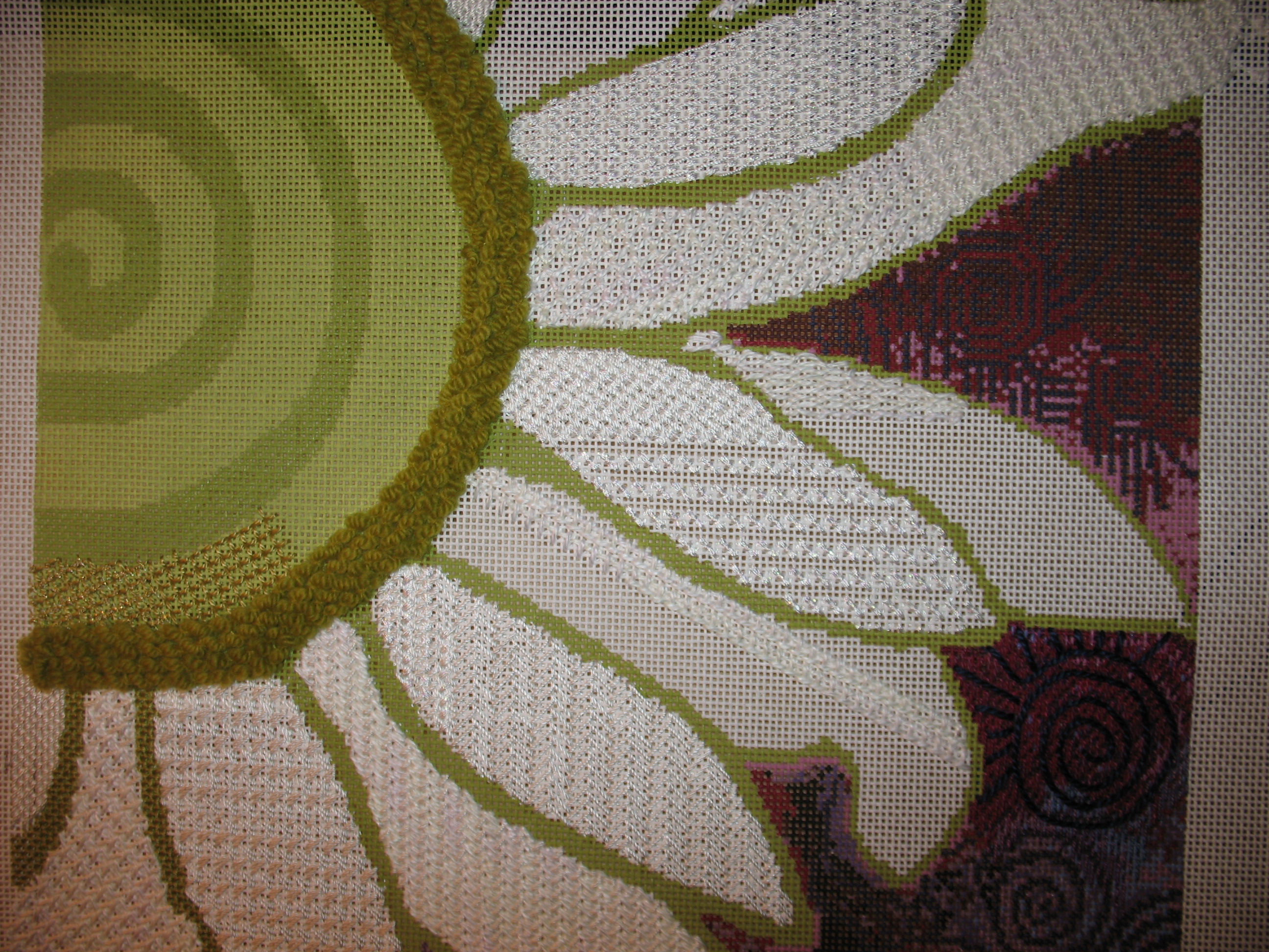 “Sun Flower” is a painted canvas selected at Fireside Stitchery in Frazer, PA for a David McCaskill workshop. I thought it was a sun until David said it was a flower! Thus, it is named “Sun Flower”.