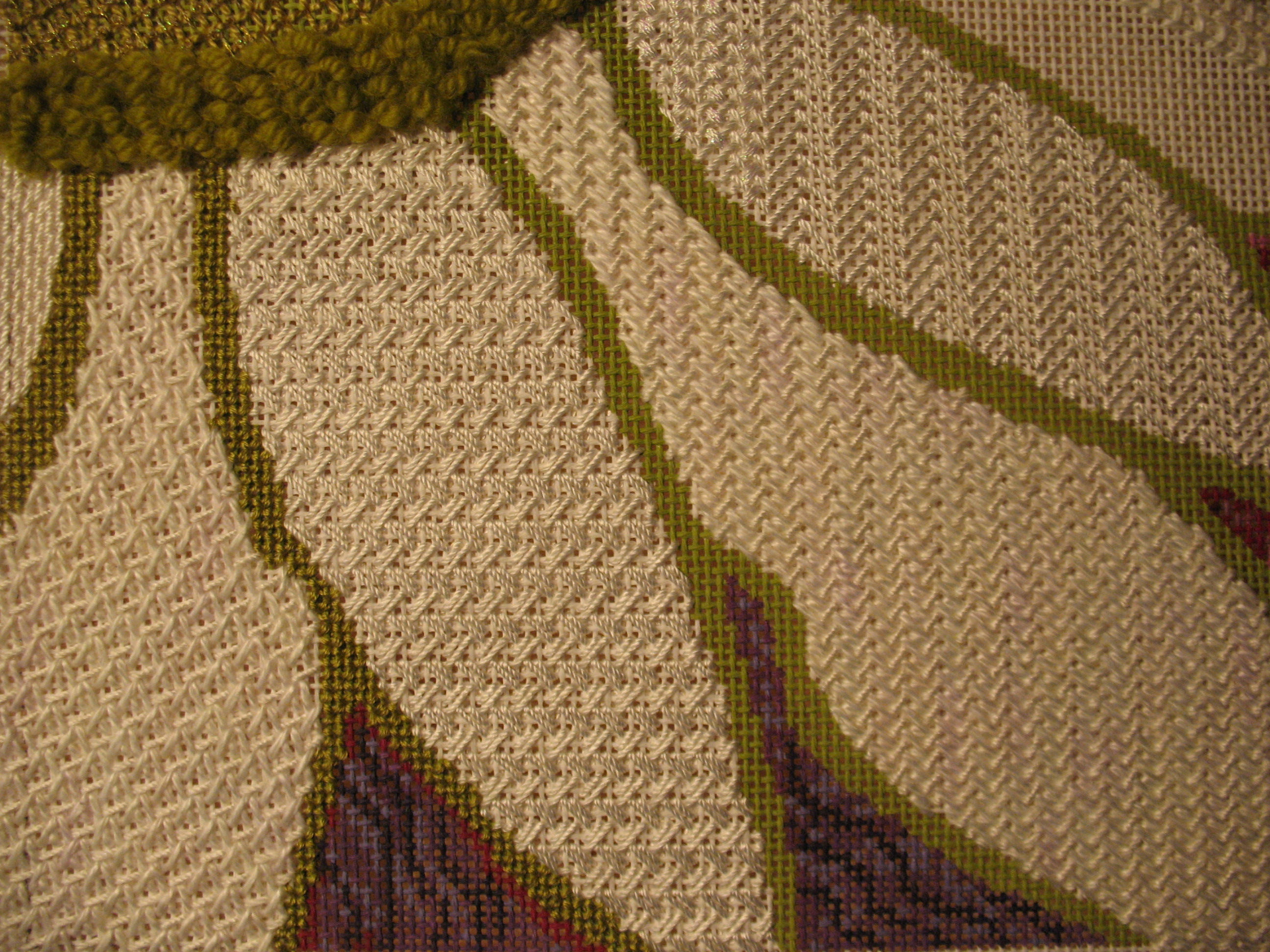 The entire area will use 3 Wildflowers by Caron (a combination of 037, 152, and 158) with DMC Cotton Perle #5 (823) couched on with DMC floss (823). The thread is thin enough to allow the canvas to show though.