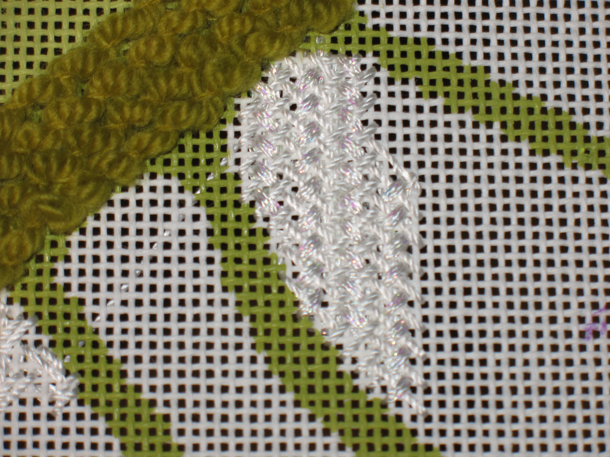 The dark green area uses Wild Hairs (WH001) from The Thread Gatherer couched using Anchor floss (280). The light green uses DMC #5 Cotton Perle (734) and Kreinik Very Fine #4 braid (3228).