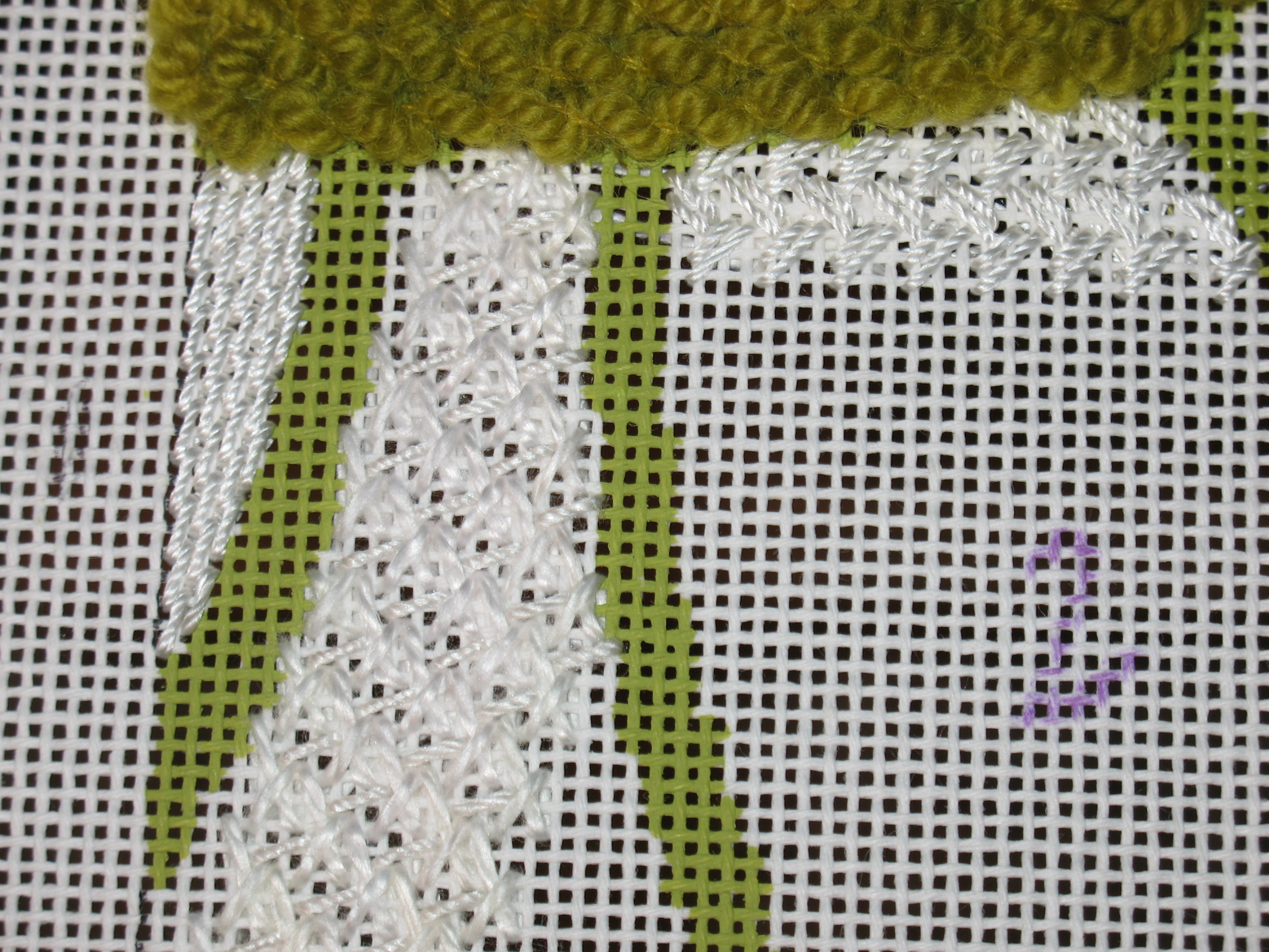 It’s only the second piece that I’ve charted on the canvas. Seemed confusing – until I was able to sit down & focus on it. I used a purple pen – or disappearing ink from a fabric store & then a pencil once I was sure I had gotten it right. The January stitch is working up quickly. It was a rainy Sunday here.