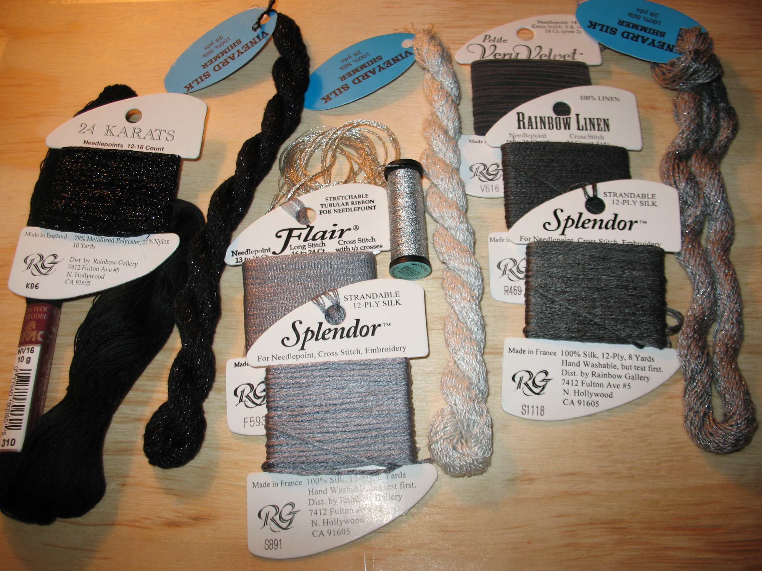 Color Family B – Light Gray: Vineyard Silk Shimmer (S-539), Splendor (S891), DMC metallic floss (silver) combined with Splendor (S891) [in place of Silk Lame], Kreinik Fine #8 Braid (001) inserted into the center of Flair (F593) [a tip & trick shared by David McCaskill & I will try in place of a Kreinik #12 braid], DMC metallic floss (silver) [in place of Accentuate metallic].