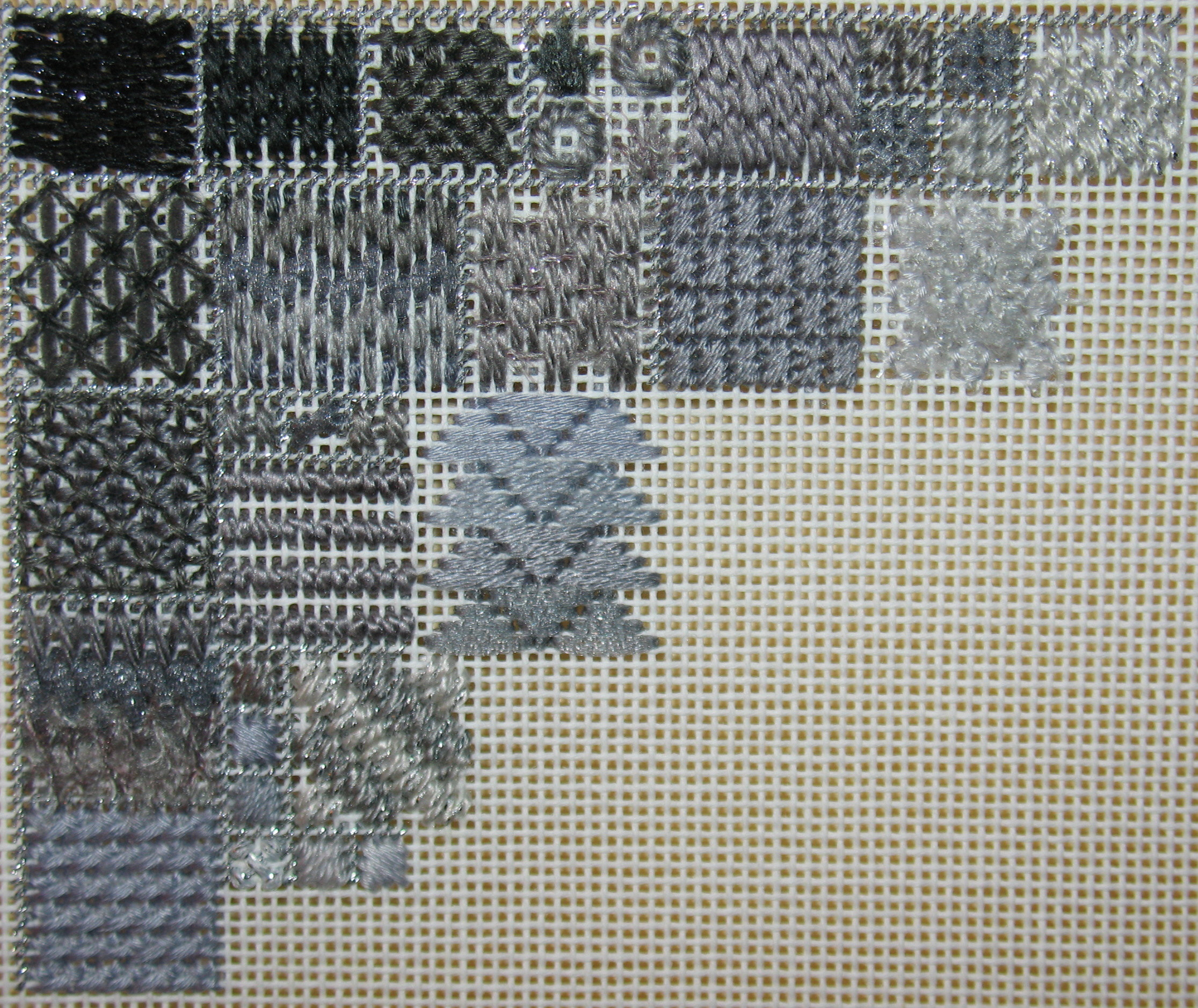 I wanted to utilize the 9-step gray scale that I learned about in Mary Shipp’s design class. And, I wanted to practice with stitches from Stitches For Effect/Stitches To Go by Suzanne Howren & Beth Robertson. But, I did not get the effect of dark (upper left) to light (moving down & to the right). And, the stitch selection didn’t help. I think this is an example of trying to do too much in one piece. I forgot about the One-Three-Five Rule from Mary’s lessons. Next time, I’ll eliminate either many of the stitches I selected or many of the thread types I selected or both!