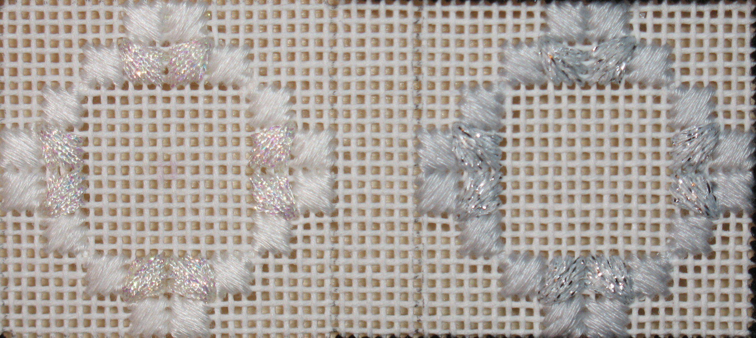 And, I found some more light gray threads. So, instead of blending DMC Metallic floss (silver) with Splendor (S891), I used 3 strands of DMC floche (762) on four outer groups. I really liked the Snow (09) with that but I only had enough for 4 of the 5 groups. So, I used DMC floche (blanc) on the center group with Kreinik 1/16” ribbon (032).