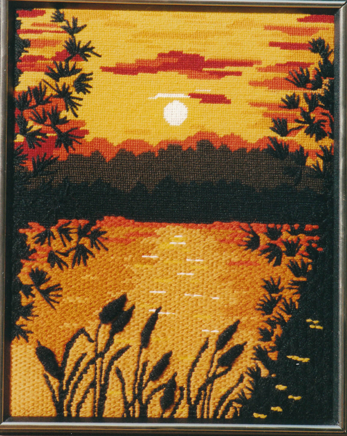 This piece is a “vintage” no doubt (not dated although it may be from 1977) & is called “Days End” from Bucilla Needlepoint & is a 12″ x 15″ finished piece on a 12 mesh painted colored canvas. There is a variety of stitches including: continental, brick, leaf, straight, satin, back, and loose loop (for the cattail) using persian crewel yarn & floss.