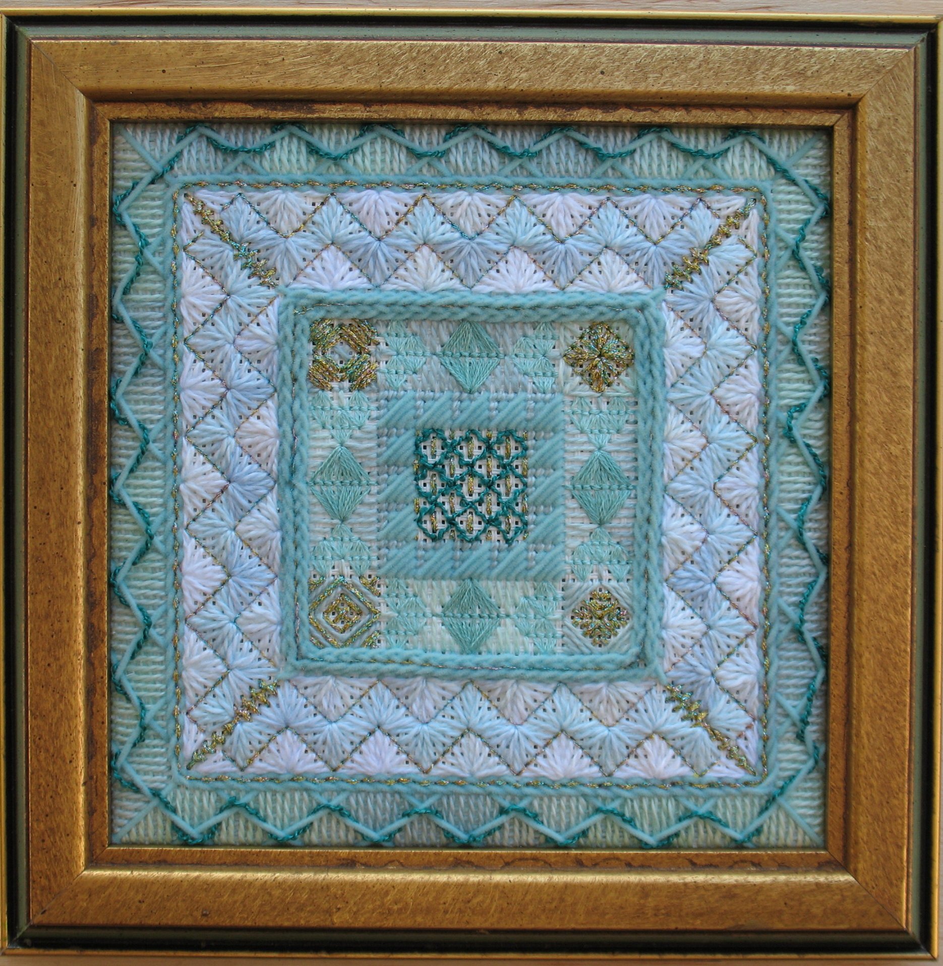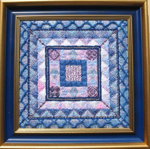Because the square frame has an inner portion of thin royal blue and gold strips, then a wider blue strip, and lastly a gold strip, I wanted to create that same ‘frame within a frame’ effect in the design area and keep the piece symmetrical. I found enough triangular-shaped stitch patterns that squared up nicely and didn’t require much compensation. Although I had to stitch no larger than the opening for the frame, I didn’t plan everything out in advance. For example, the Triangular Ray band, had a diagonal gap that filled in nicely by the Pearl stitch, with its small triangle portions, and really added to the effect of depth. The Raised Lattice Band for the outermost band could be as wide as needed. It all seemed to fit into place as I progressed.