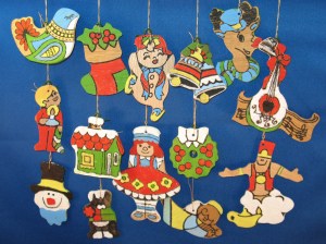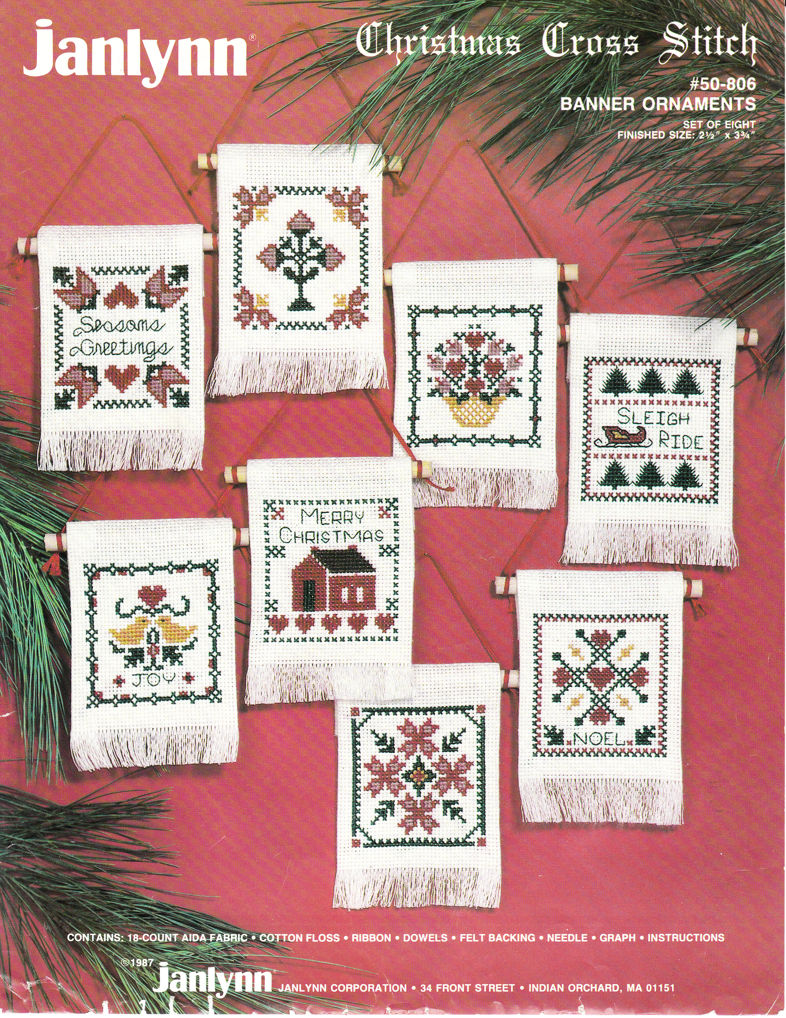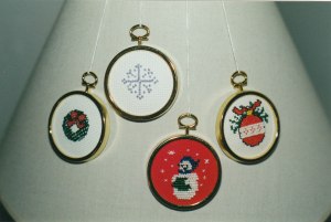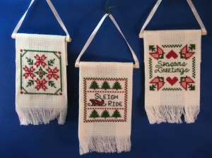 These are some more cross stitch ornaments, 8 to the set. I finished off them myself by cutting the dowels, glueing the ribbon hangers, & applying felt backings. Believe it or not, I actually made the set of 8 for my mother, my sister (& her husband), my brother (& his wife), my husband’s mother, my husband’s sister (& husband), 2 girlfriends, & myself – 64 ornaments in total! Can’ just make one set – no!