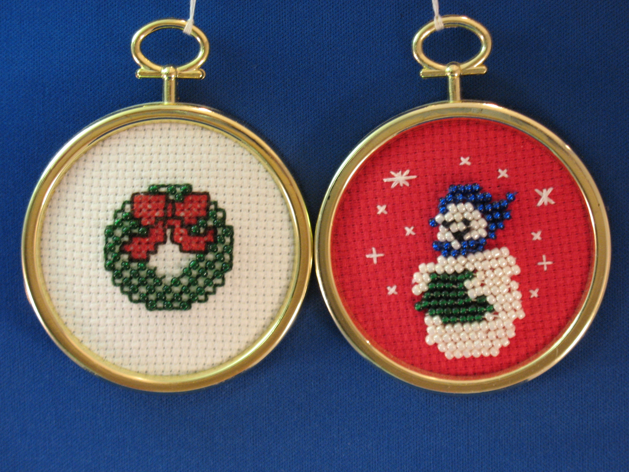I followed the design for these are small round ornaments except that I added beads where I didn’t do cross stitching. They are from a Leisure Arts Leaflet (#197) dated 1981. I still have a nice stash of beads from this period of stitching which will come in handy for the finishing touch in the ANG Stitch of the Month (SOTM) Mystery Project 2010!