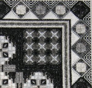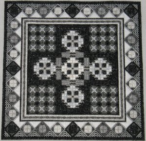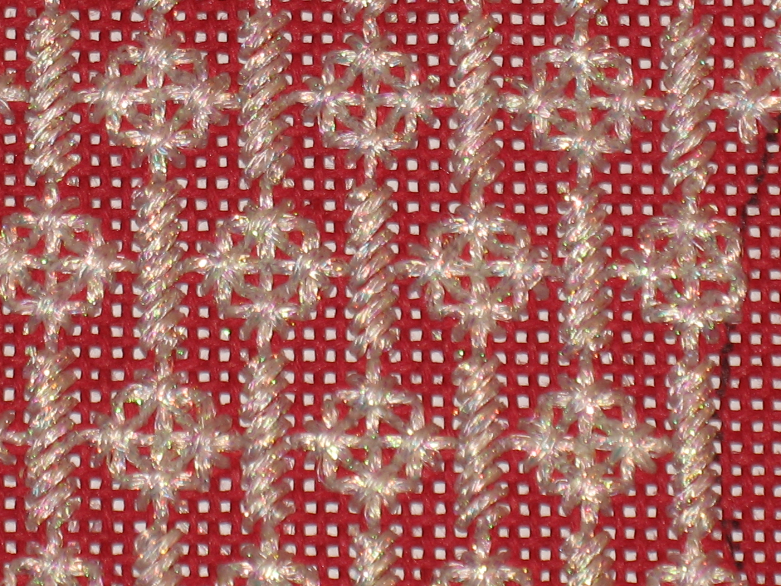 Faced with 2010 running out of days, I decided to use straight stitches on the inner portion of the border. Initially, I stitched them at an angle like the outer border but it was too heavy-looking compared to the open black area (you’ll have to take my word for it because the picture really didn’t show it well enough to post). So, I slept on it, ripped it out, & switched directions to minimize the effect of stitching in that area. The threads kind of fill in the shaft between the canvas threads making the white stitches less prominent. And, it worked up quickly so I can get to the last border!!