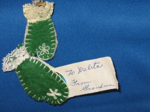 She was a great seamstress (sewed dance costumes for my mother & later for my mother’s dance pupils). These are cute felt mittens with a hair clip inside to grab something.