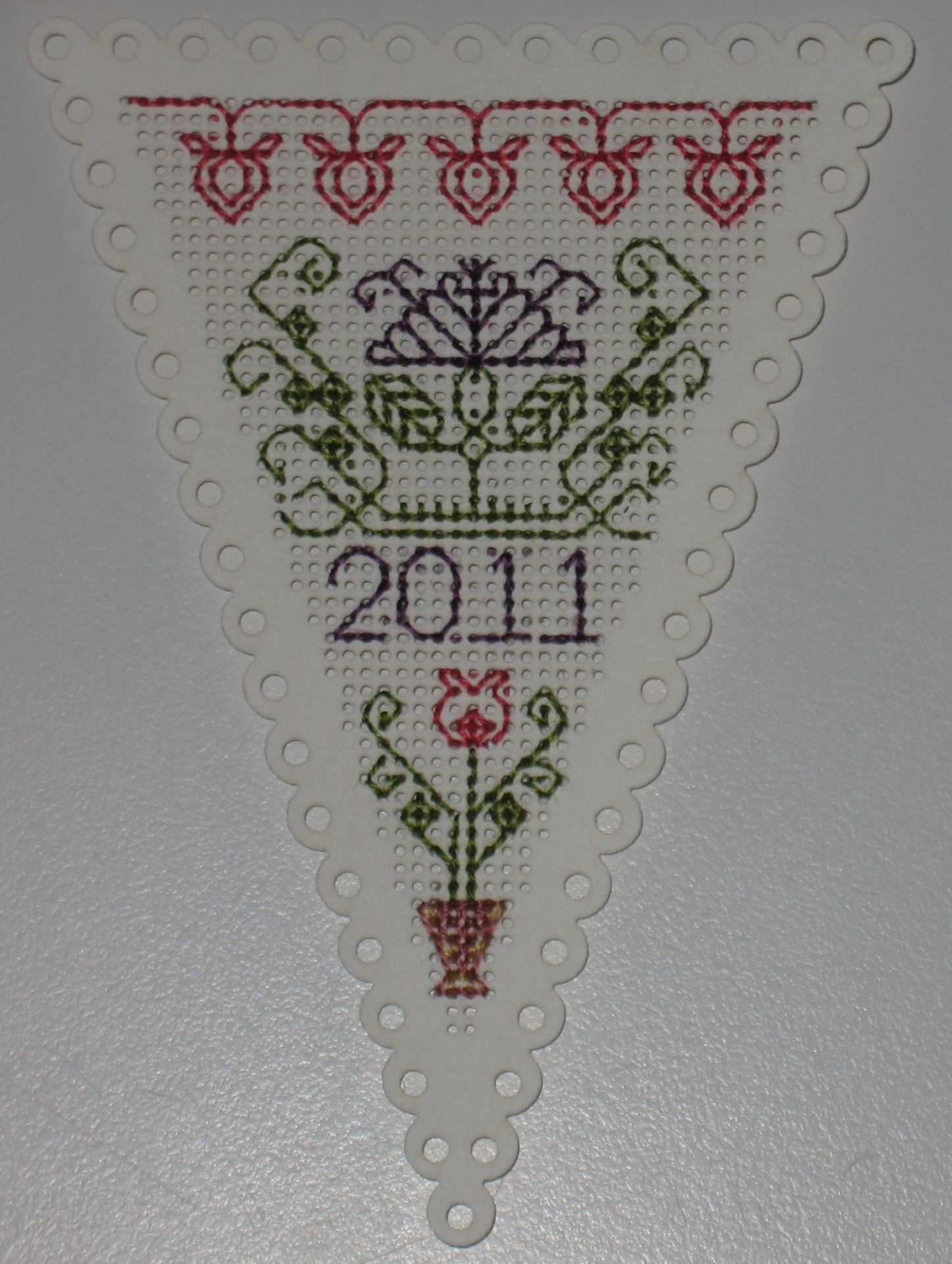The scissors sheath is made on 20-count Confection Perforated Sewing Cards from Tokens and Trifles. However, they were out of stock until at least February. But rather than wait & find myself in a difficult position of having to scramble with little time, I started contacting retailers identified on the Tokens & Trifles website as being retailers. Well, I ended up contacting 3 stores still in operation who had a few packages in stock. So, I’d like to thank Lavinia from Counted Embroidery in Califon, NJ, Sue from The Log House in New Castle, PA, and Judy from Judy’s Stitchery Nook in Harlingen, TX all of whom were generous to give a discount on the packages. In addition, Sue sent along patterns for other ornaments in case our chapter members would be interested in doing any of them. So nice!! I also want to mention that Nordic Needle, who was selling back issues of the magazine, referred us to the publisher, Hoffman Media LLC, because we wanted 20 copies & we got a 40% discount when we told them we were an ANG Chapter!