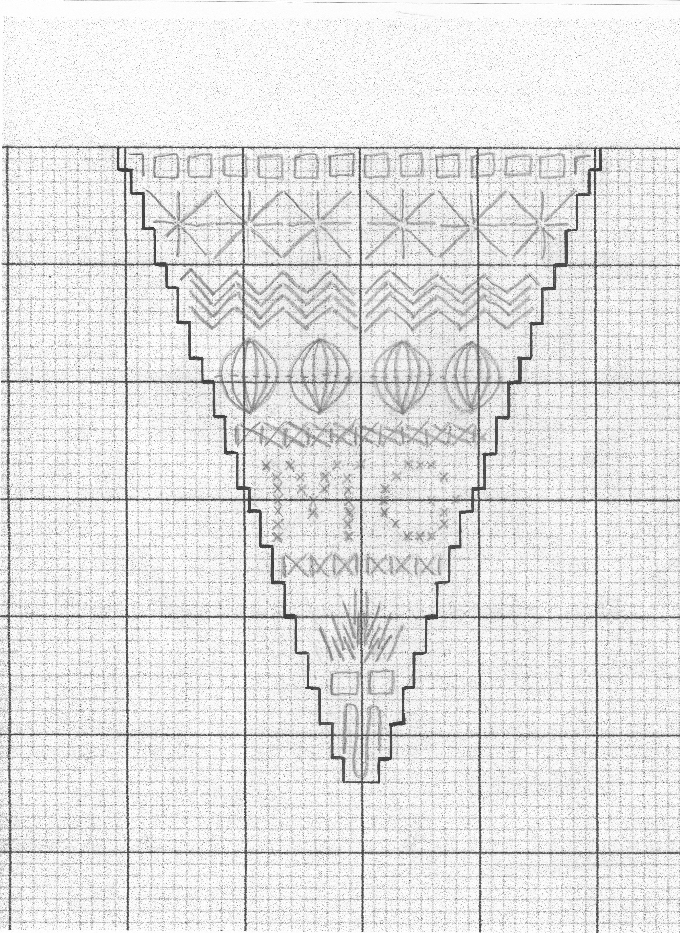 Next, you’ll see the back as diagrammed in the Sampler & Antique Needlework magazine (Summer 2009) for Plimoth Scissors Sheath. It is a pretty pattern too & I didn’t want the back & the front the same.