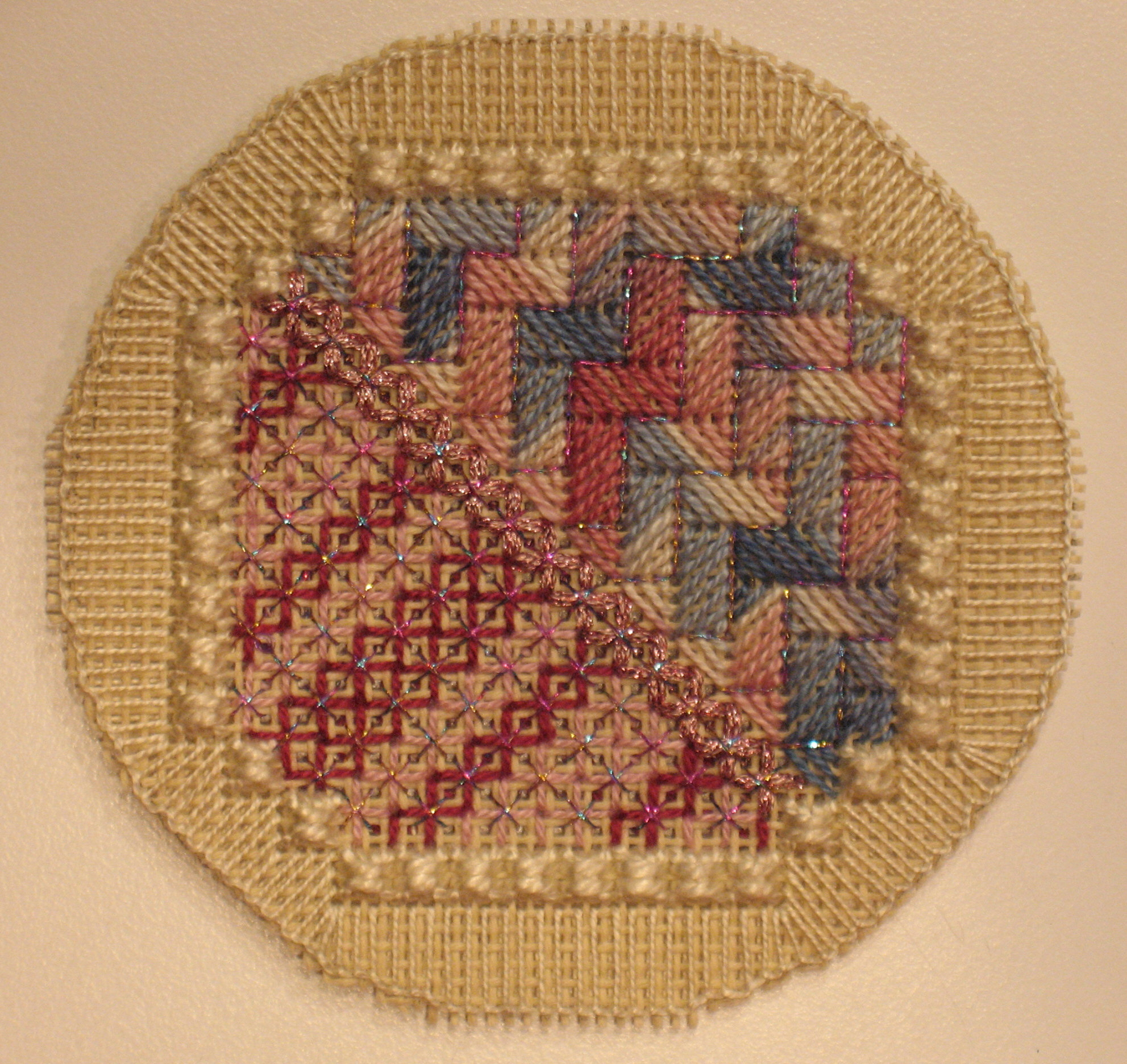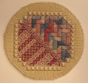 And, it’s first because I want to give it (bottom picture) to my framer (Dan at The Framers Workshop in Philadelphia) who I’ll be seeing this weekend to drop off the 2010 SOTM for framing. I got lucky finding a 5″x5″ matte in the brown frame. I just added a few stitches along the edge & into the unstitched corners (a Byzantine filler).