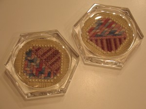 The coasters in the bottom left corner of my pending projects picture needed to be cut in a round shape. But, I didn’t want them fraying or looking unfinished. So, I decided to stitch up to the design in a blanket stitch. That also allowed me to cut right up to the edge.