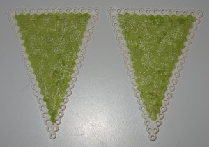 At AC Moore, I found Peel n Stick which are sheets of double-sided adhesive film. It cut to size, created an instant bond just by pressing, should add some support to the perforated paper, & will be easy to place in everyone’s kit. Then, I cut the lining which is Fabric Palette’s Craft Fabric in lime green that has a little glitter to it. You won’t be seeing the lining really but white seemed so boring & this looked spring-like to me. The last step will be to sew both sides together. Well, really, the last step will be putting kits together for everyone.