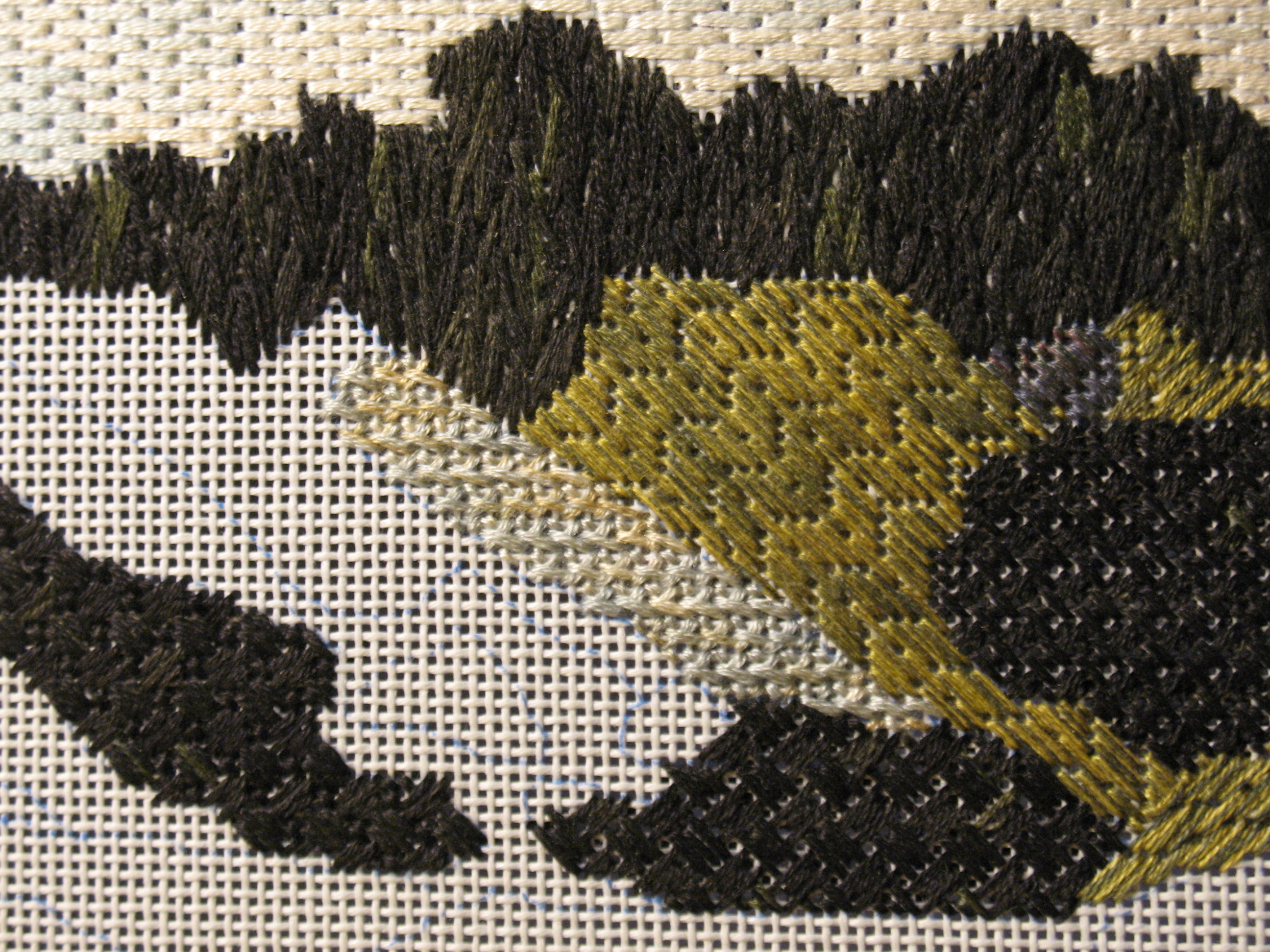 The blue patch among the dark green grassy areas needed to be angled & upright. So, I found Zig Zag Stripe but did a variation of it by off setting the stripe. And, I filled in the empty spaces by a single cross stitch. It increased the denseness of the stitch & added to the slope.