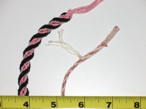 On Oct 10, Carol from The Bead Garden will teach an advanced 12-cord Z-braid. She’ll share tips and show us a different way to start the braid. Carol has examples of various braid techniques. And, she has learned even from books written in Japanese! We’ll have enough hemp cording to distribute or they can use their own thread & have it ready for November’s finishing class. These are 2 of her braids using 12 cords & comments about each. From left to right: (1) Pink & black braid: 2 colors of wool/yarn (8 strands of pink, 4 strands of black) – the 3-dimensional effect is more obvious than in the smaller braid; (2) Pink & white braid: 2 colors of DMC #3 (4 strands each of mauve, pink, & white) – a little fancier braid than the simple one