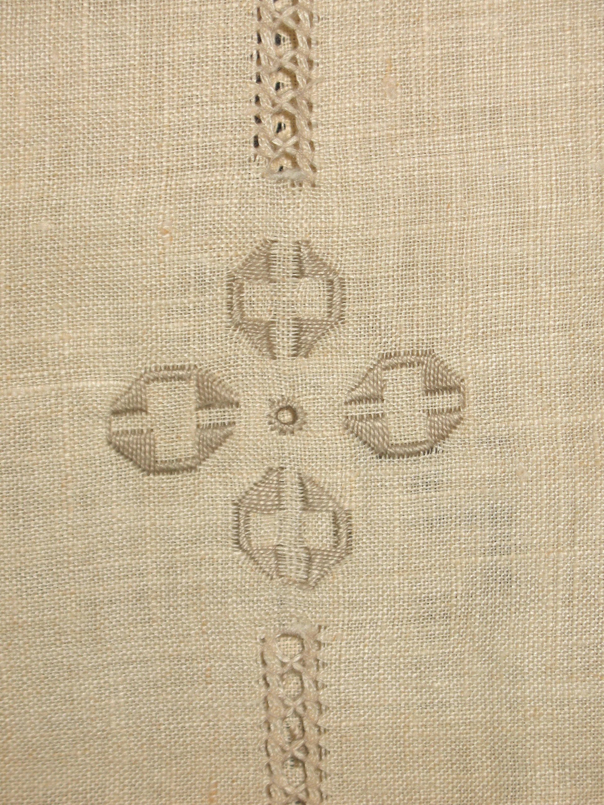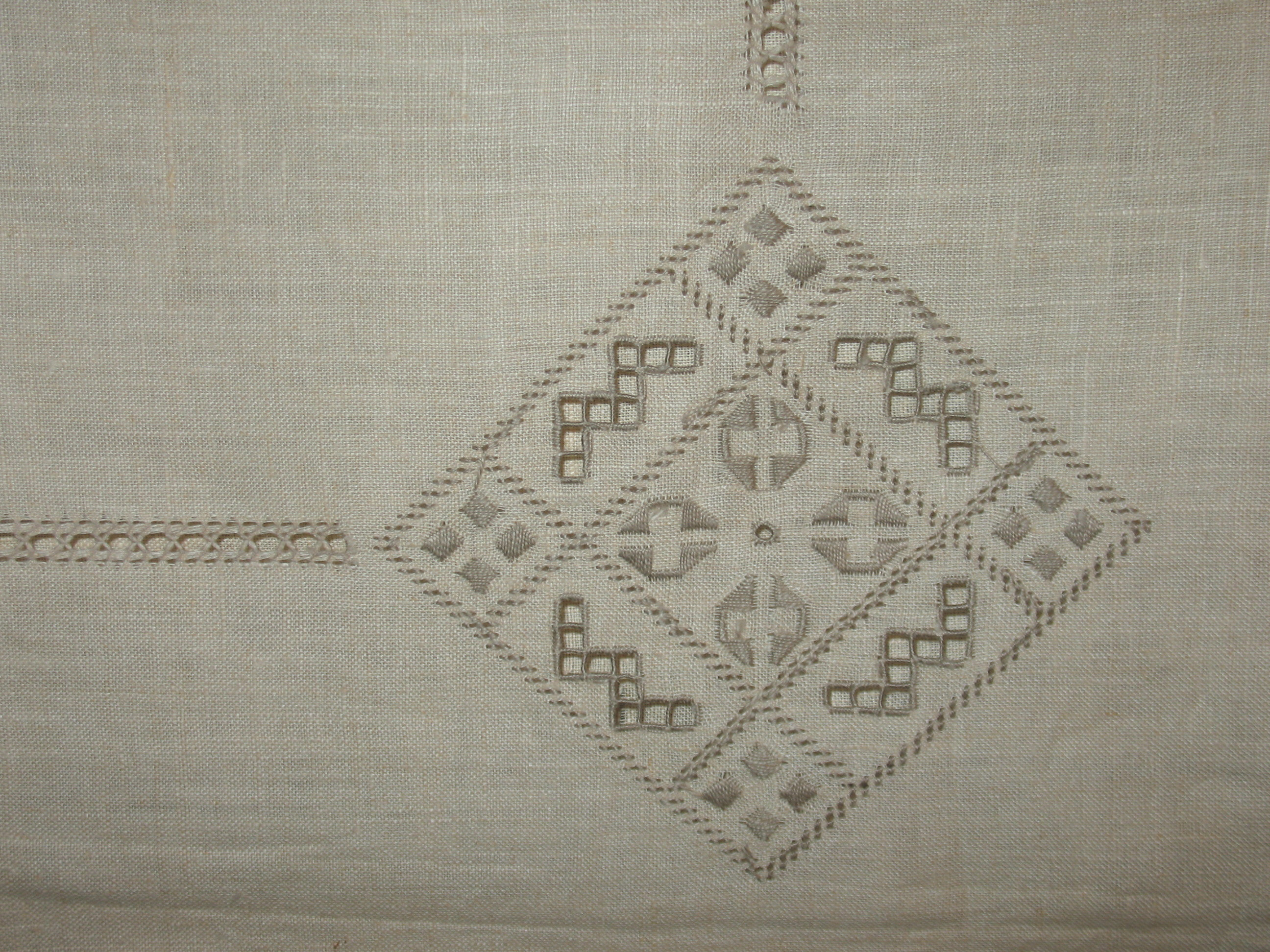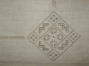 Finding these vintage pieces is a wonderful opportunity to learn more about the craft of needlework. It looked like a Pulled Thread technique but wasn’t sure. So, I googled it. Thanks to Nordic Needle’s website, I learned about the broad categories of whitework & the more specific areas of open-work called Pulled Thread & Drawn Thread. This could have examples of both. Drawn work involves cutting threads & removing them. While pulled involves no cutting. But, I continued to explore & see that it may well be Hardanger Embroidery which employs a combination of techniques including the use of satin stitch & eyelets which this table-cloth has too.
