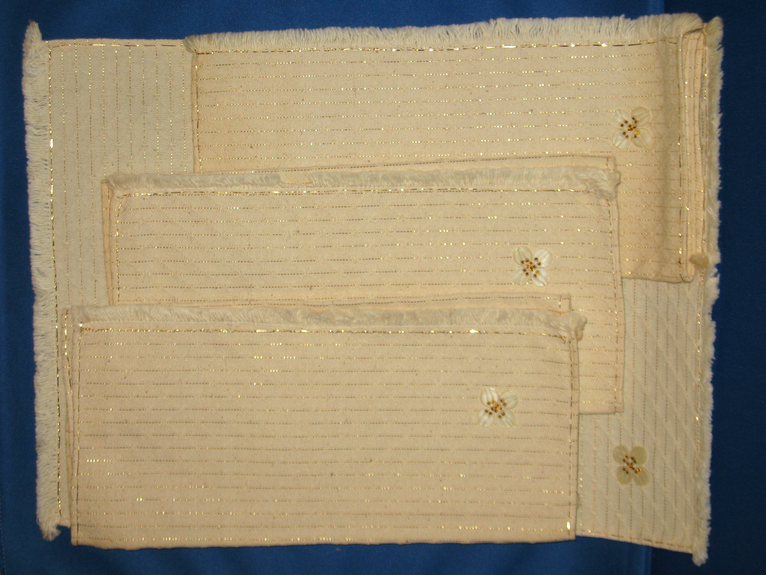 I’m not sure who made these place mats & napkins but they look Christmasy. They have buttons & beads with a little gold embellishment stitched on them. Very good shape & makes a nice set with the different colored napkins.