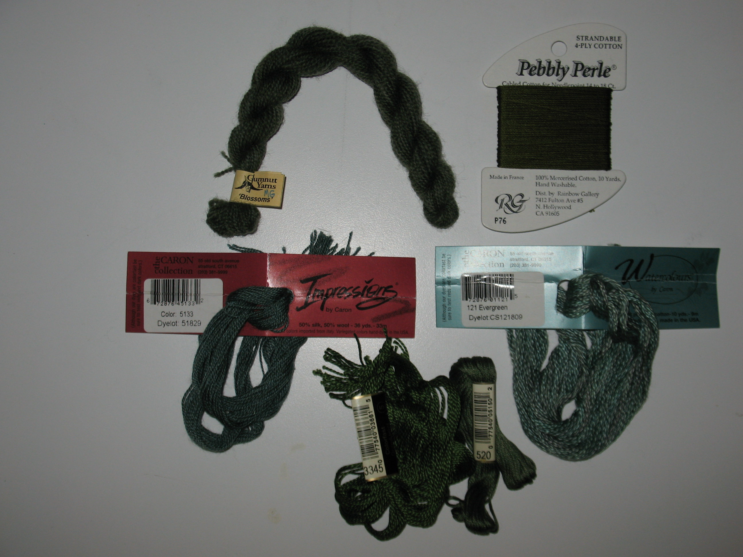 DMC #5 blanc, 334, 367, 890, 3346 (2x), 3348