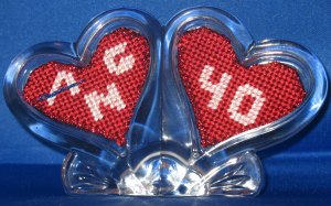 I wanted to stitch something to thank all the volunteers but unfortunately that’s too many people to personally stitch one for each person. So, I decided to stitch one for each day & hold a daily drawing – one chance for every hour worked. This is for the Day 7 winner. It is a double heart glass frame measuring (to be added later) designed it on 14 count red vinyl canvas (from crafterspride.com under fabrics) to fit the space. I like the vinyl because the edges don’t fray.