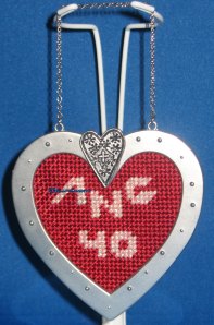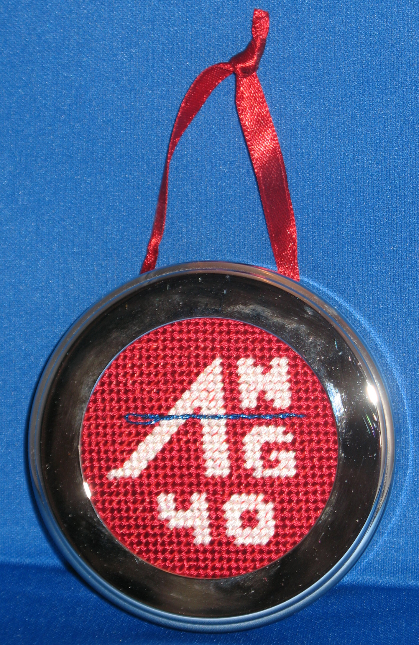 I wanted to stitch something to thank all the volunteers but unfortunately that’s too many people to personally stitch one for each person. So, I decided to stitch one for each day & hold a daily drawing – one chance for every hour worked. This is for the Day 1 winner. It is a silver ornament measuring 3″ x 3″ with a design area of 2&1/2″ x 2&1/4″. I got the ornament on a sale table somewhere & designed it on 14 count red vinyl canvas (from crafterspride.com under fabrics) to fit the space. I like the vinyl because the edges don’t fray.