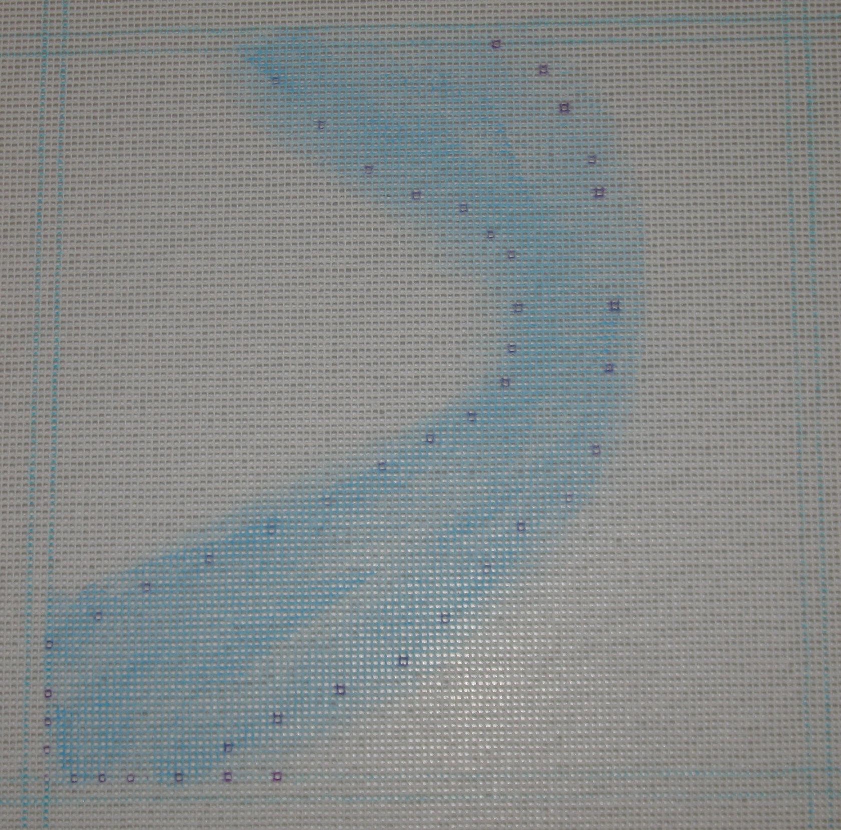 The blue Copic marker didn’t look good with my blue threads. So, I got the paint out. And, I am glad I did. I’m very happy that there are areas with a little less paint than other areas. I went beyond the area where the crescents will sit because the cresents are supposed to be the ripples in the water. The purple dots you see are the Disappearing Ink Pen marks. I’ll have to get the crescents stitched soon or keep reapplying more ink! The borders are marked by the Mark-Be-Gone Pen (water washable) but they should get covered by stitching. My framer says he like about 3 extra stitched rows on the edges to work with.