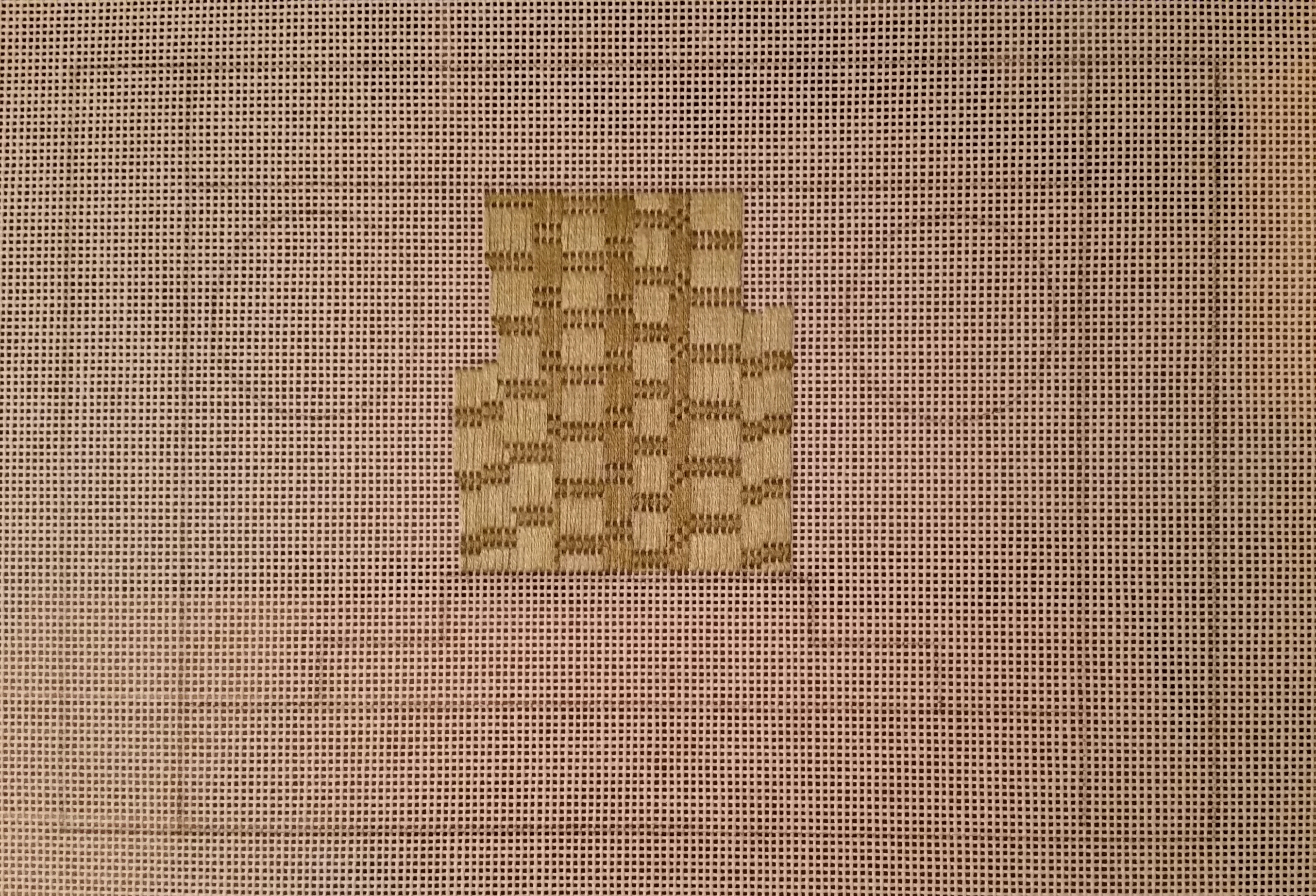 Initially, the small squares were going to be Rhodes stitch but Sharon G thought they wouldn’t compensate easily & suggested Double Leviathan but that pattern covers 4 threads & the square was 5 threads. So, I did my best with the Rhodes using Gloriana (#088 Seaweed).