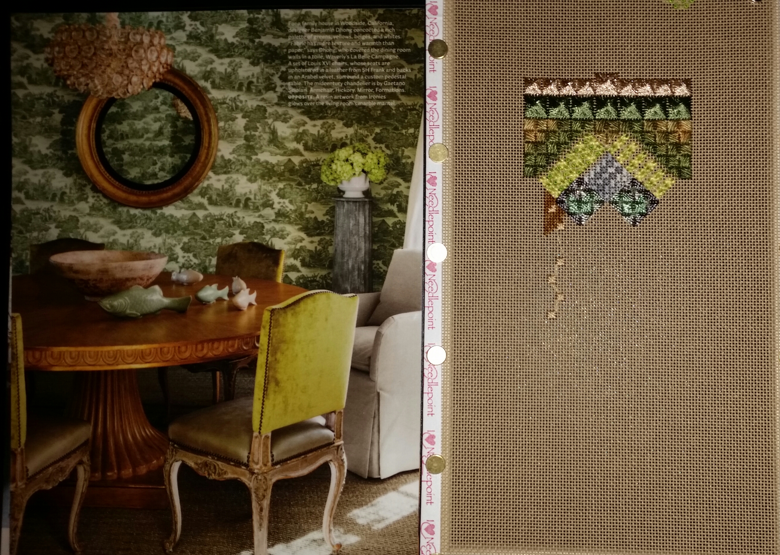 I think I should explain that we had 2 photos to select from. I selected 1 of the 2 most difficult pictures of the 15! The combo of different greens is challenging for me to do. But, going out of my comfort zone was intentional. And, I think I included all the colors. I found the overdyed green Edmar thread in my stash that I loved for the wallpaper after I had stitched the top portion or else I probably would have placed the Edmar under the 2 rows of Rhodes. By the way, the Edmar was in a thread package I had purchased from Orna’s Etsy site! She is an excellent teacher and I learned a lot from her demonstrations of French Knots, Jessicas, and laying threads!