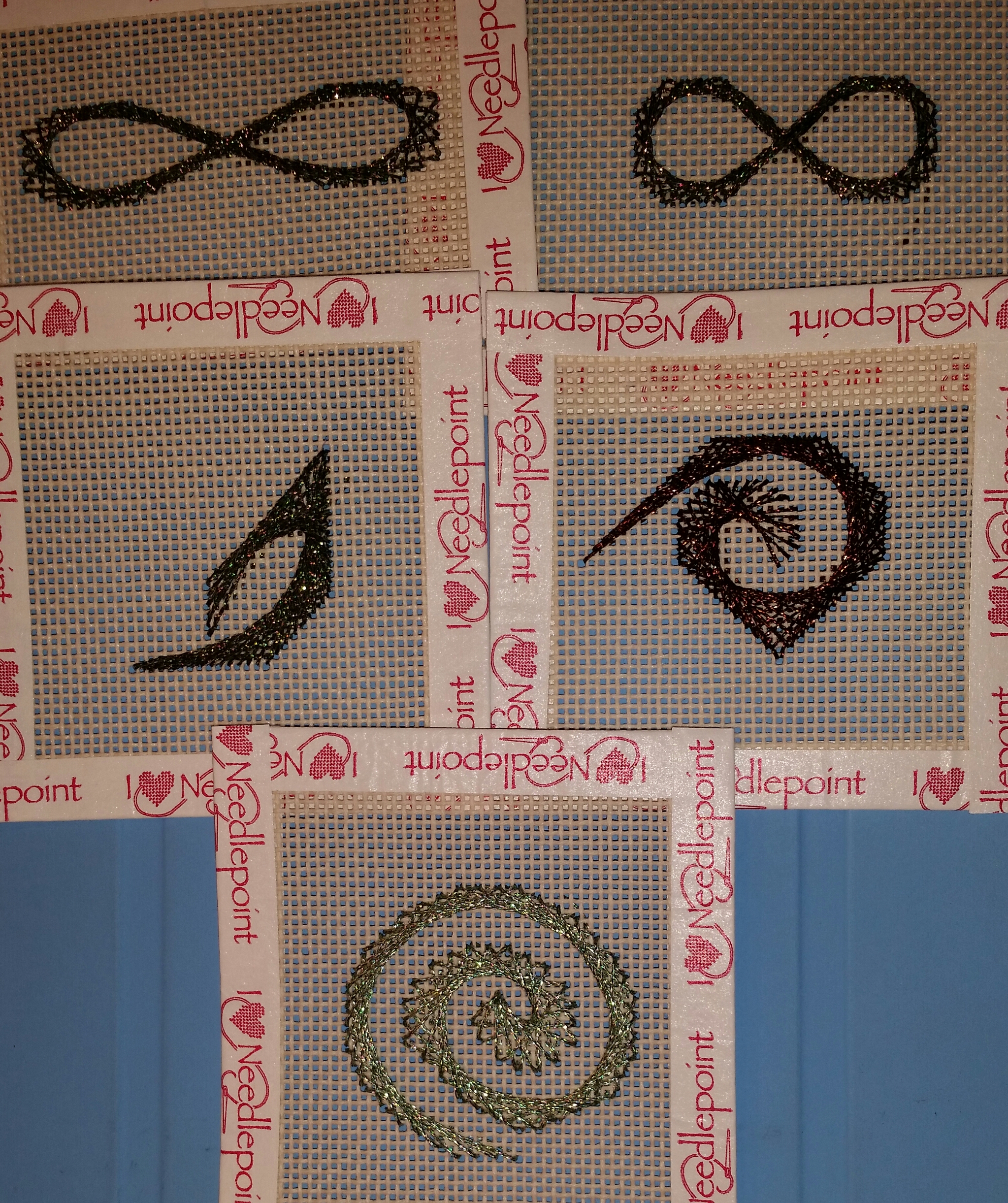 Recently, I have playing with Jean Hilton stitches to understand them. How they work so I can adapt to pieces I’m working on. These came from Jean Hilton’s Stimulating Stitches (infinity symbol, raccoon eyes, leaf, curved leaf, nautilus) (page 13).