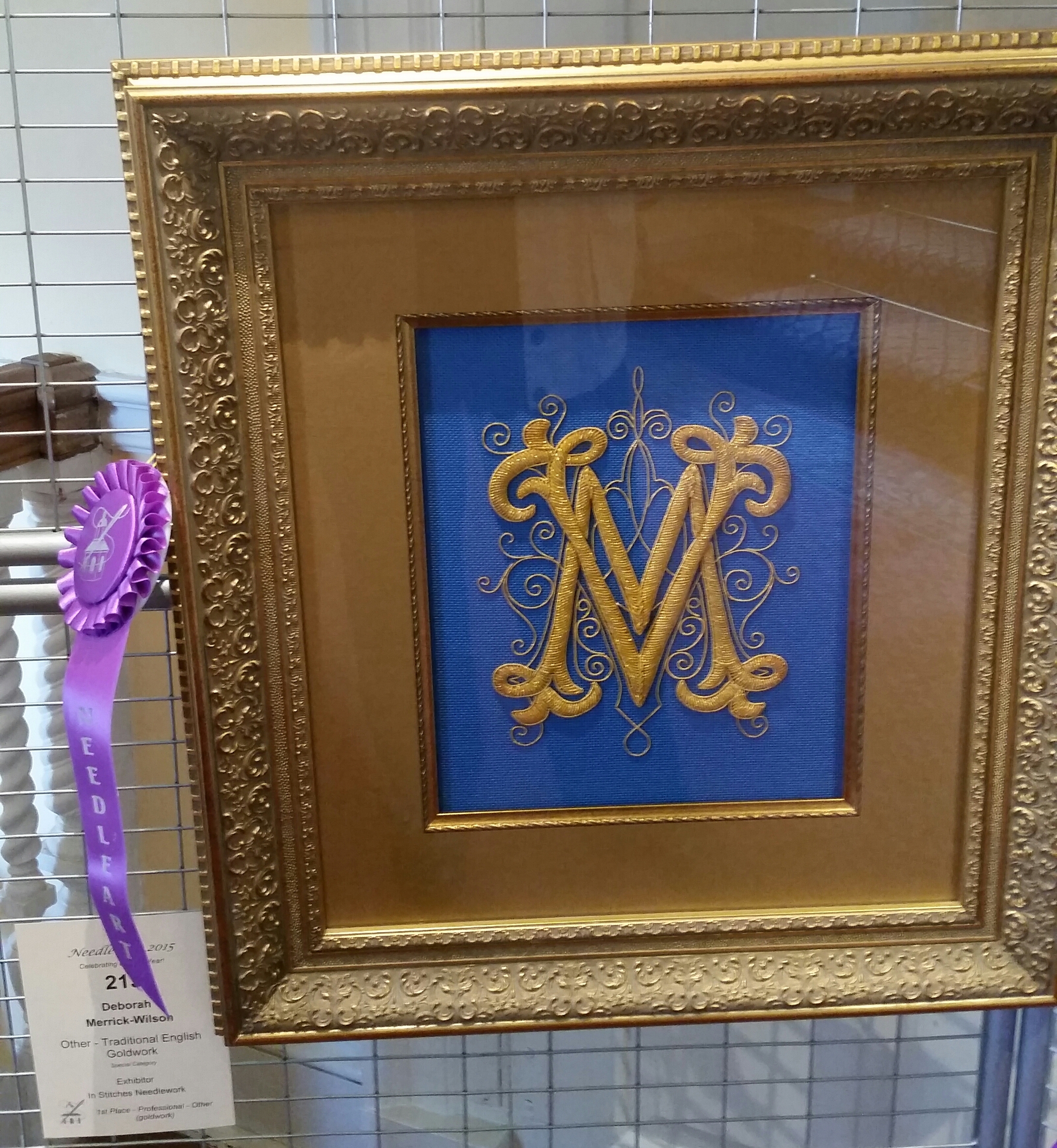 Deborah Merrick-Wilson had 2 first place winners. One was traditional English goldwork of a monogram – I only saw a really fancy M but Deborah pointed out the V (now I see it) that she stitched years ago for her good friend and a past member of my ANG Main Line Chapter, Mae V-D who passed away recently. The other piece is a flower and leaves of goldwork with thread stitched on counted canvas. With Deborah’s permission, I can share these photos. Congrats to Deborah! And, either of her 2 small goldwork flowers would be great for another class next year!!