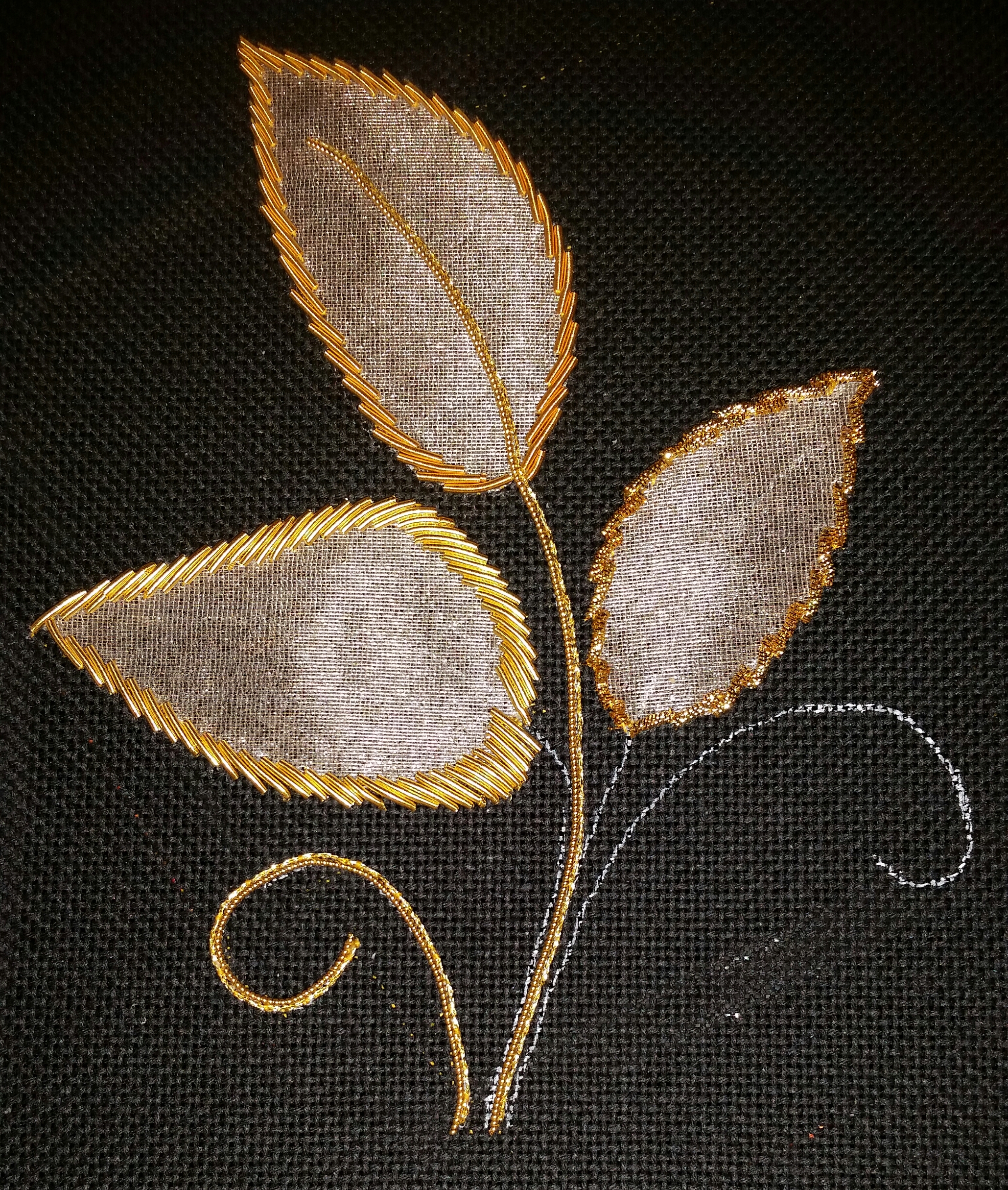 All 3 leaves are outlined now. My bottom left leaf is heavier than the model but that’s ok! I decided to just go full steam ahead and not worry (too much) how good it turns out. I still did enough unstitching. I found the smooth purl and the shape of the 3rd leaf the most difficult. Maybe I should have repositioned the canvas. Now the light dawns! Oh well. I’m happy it felt more comfortable especially since Saturday is my second goldwork class. This will also be a one-day class but with Deborah Wilson (recent Woodlawn winner & author of the goldwork chapter in Amy Bunger’s Cookbook).