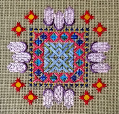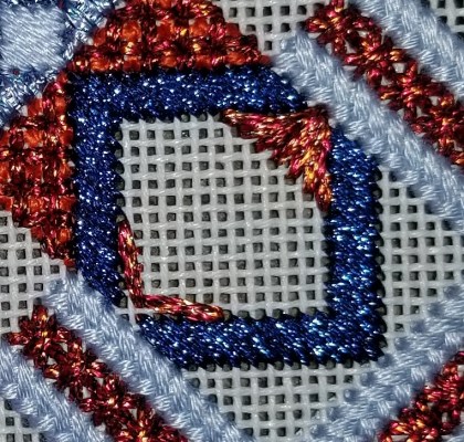 This month’s installment of the ANG Keystone Garden Chapter’s mystery project added 2 rows of Diagonal Gobelin and corner Ray Stitches. Looking Good!