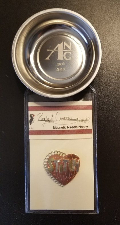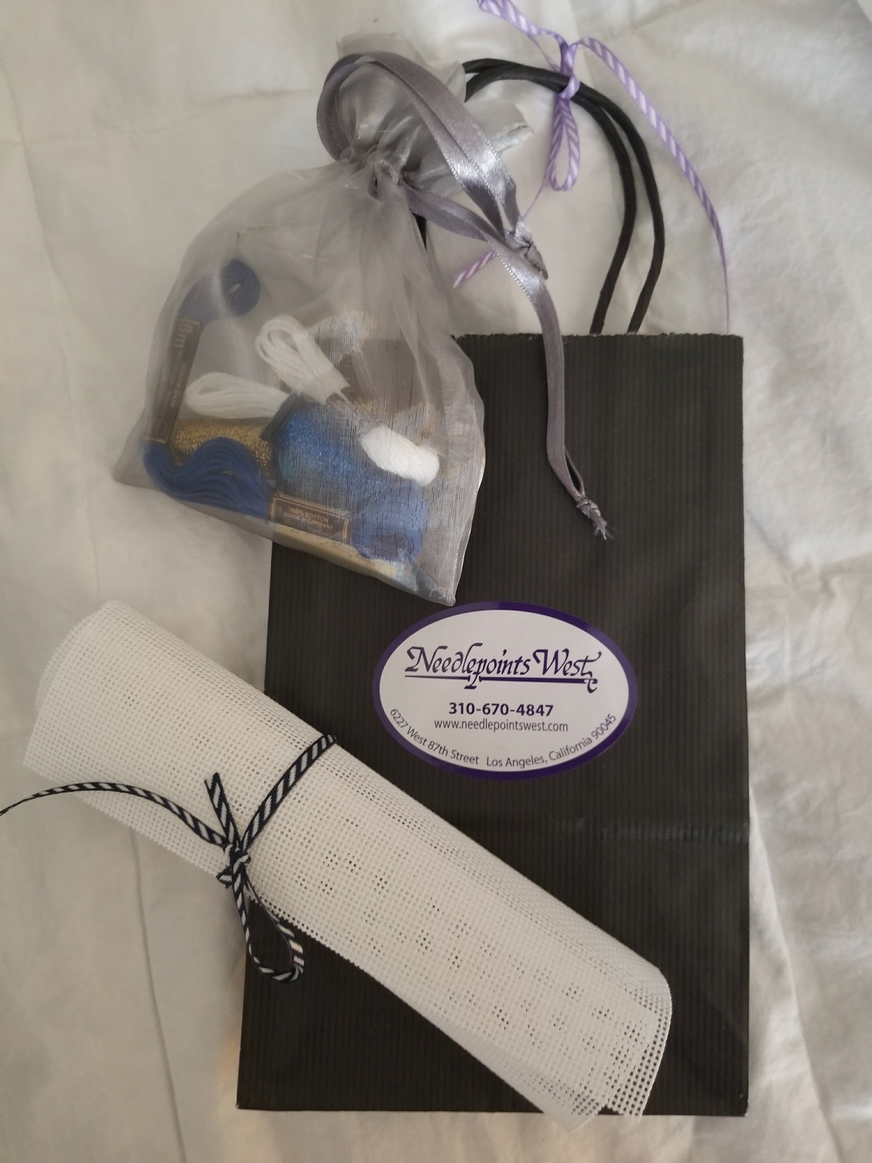 And, Needlepoints West, the store at Seminar, was very generous especially on Friday offering 45% off canvases & 50% off select threads. More on why I picked up this canvas another time. And, they gave the kit for the Nancy Cucci 45th ANG anniversary design away for free.