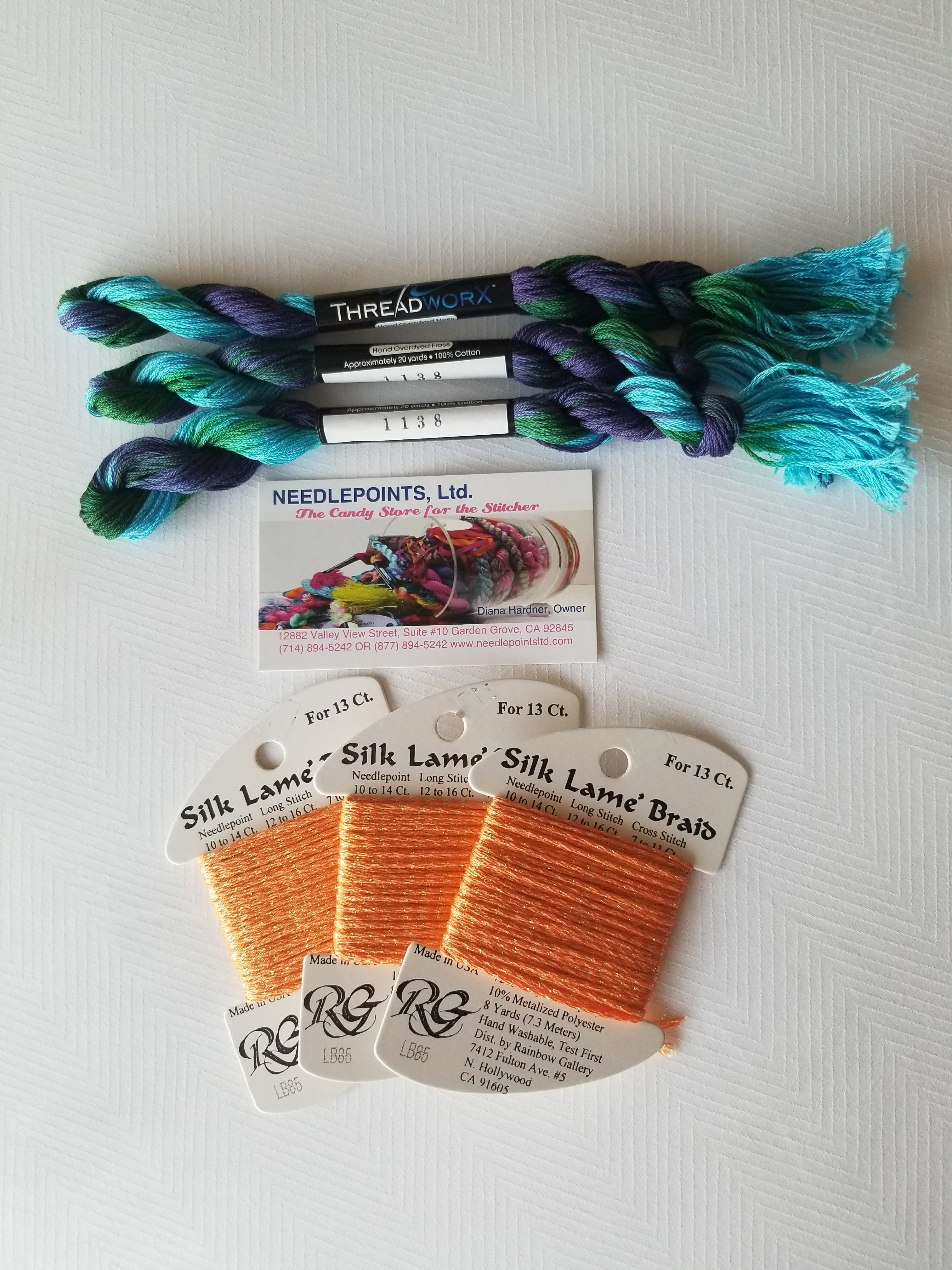 I had to stop briefly at Needlepoints Ltd on our way to San Diego. Diana and her store are very nice. Lots of threads. A nice table with magnifier/light stands (around to right but not pictured). Two other ANG members were there when I arrived.
