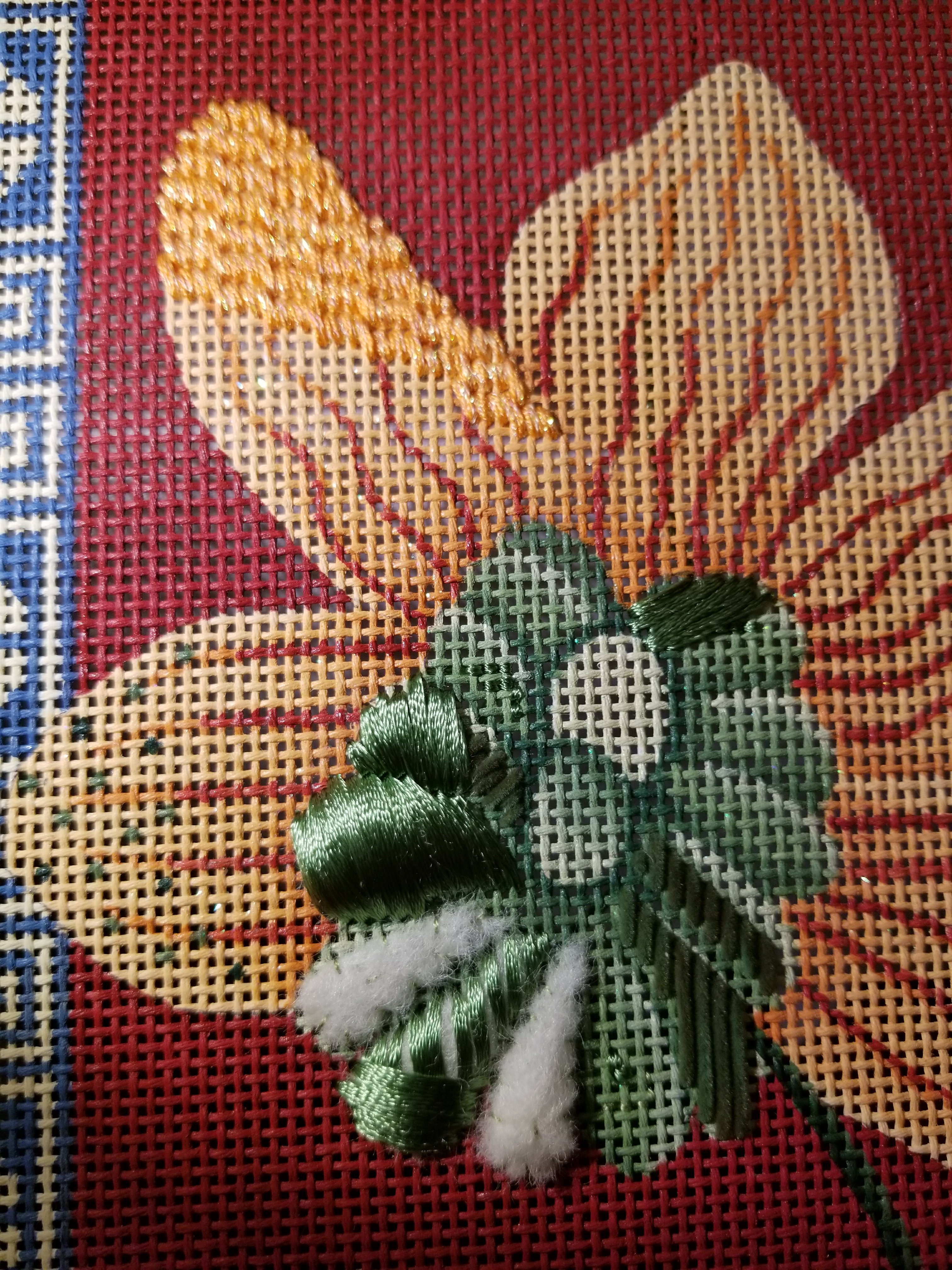The Diamond Rhodes stitch and Diagonal Gobelin stitch worked up so quickly that I was done during our ANG Keystone Garden Chapter meeting this month. It’s a mystery project that we add to each month for a year. We’re almost done!!