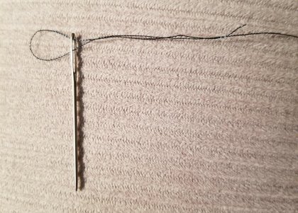 I’ve used a Larks Head Knot to lock a thread on the canvas when I need to stitch with 2 stands. For this, you lock in the center of the thread. But, you can also use this knot to lock the thread onto a needle to prevent it from falling out of the eye. And, you can stitch with just one thread by locking it near one end of the thread.