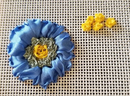 Betty Pillsbury is giving us a great class on using ribbons, sequins, and beads. Learning a lot and got a lot done. Pam, from Edwardian Needle, provided a generous kit and Betty brought some more stuff for us to try. I’m the only one that stitched a base and Betty is accommodating me without any problem.