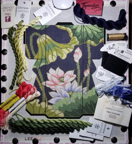 I’ve got Splendor S801 for the trim; Elegance E801 for the black seam lines; Kreinik #4 and #8 Braids 002V for gold; Gloriana 185, Gloriana 048, and Silk ‘n Colors 1068 for the trumpet flowers; Gloriana 288, 096, and 117 for the lily pads; Chameleon Shades of Africa Two Oceans (Au Ver a Soie) for blue lotus flower; Needlepoint Inc Silk 877, 571, 501A, and 501 for the salmon lotus flower; and Impressions 7011 for the navy background.