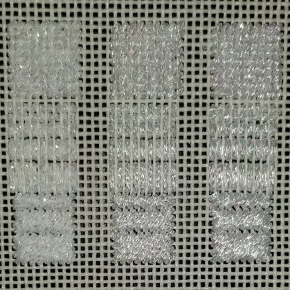 As part of an ongoing thread project for my ANG Main Line Stitchers Chapter, I researched the following chainette threads: 24 Karats, Alabaster, Cresta d Oro, Gold Rush, Nordic Gold, Snow, and Winter. A chainette is like a chain of crocheting. Because each chain is tucked into the one before it, it can unravel. I didn’t experience that while stitching with either Snow, Alabaster, or Winter. However, I was able to pull on all 5 chainettes that I had samples of and make them unravel. If you experience unraveling, there are several options: cut off the raveled part and rethread your needle; use a larger needle to open the hole and pull straight through the canvas to create less friction; use Fray Check; or, apply heat to the frayed end with a thread burner tool.
