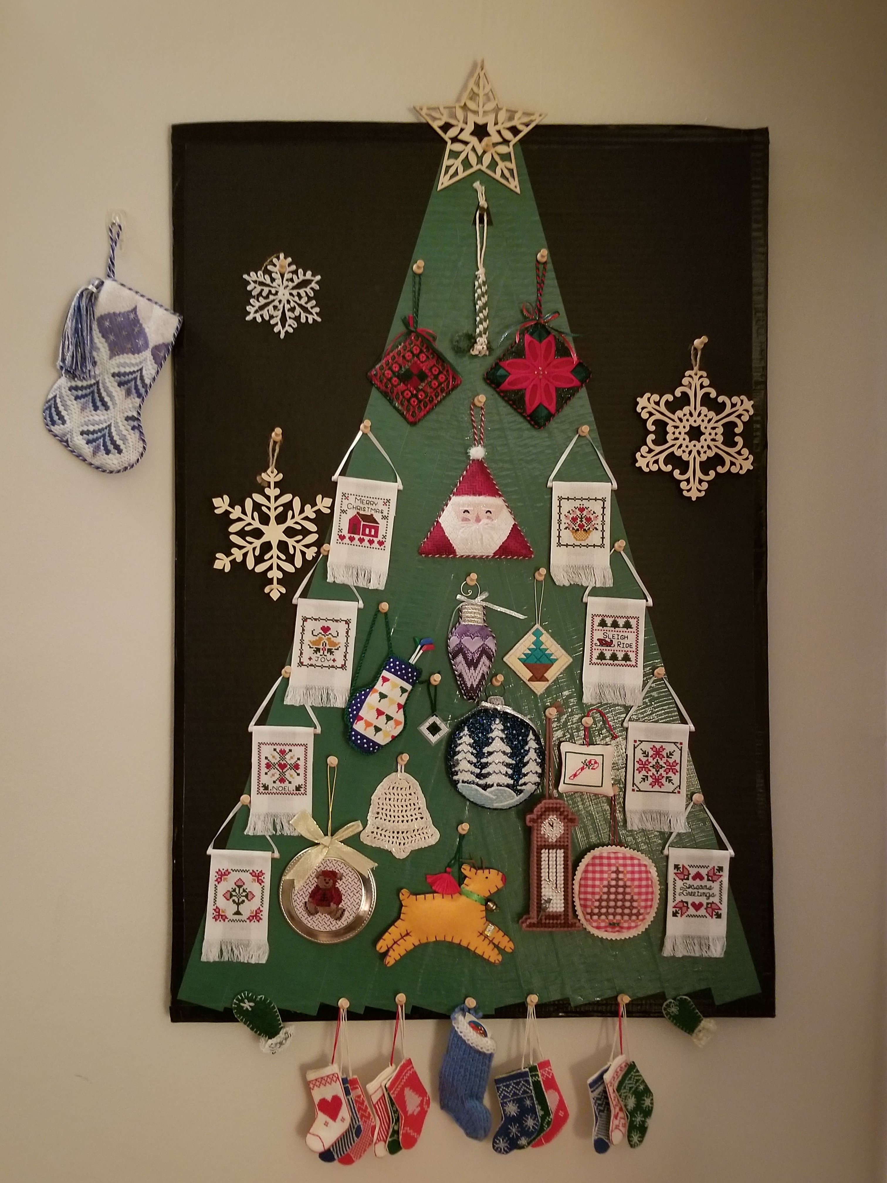 This year, the tree holds a different collection of ornaments including more needlepoint ornaments than cross stitch designs that were displayed in 2016. The golf bag and purple bulb near the center are probably the newest.
