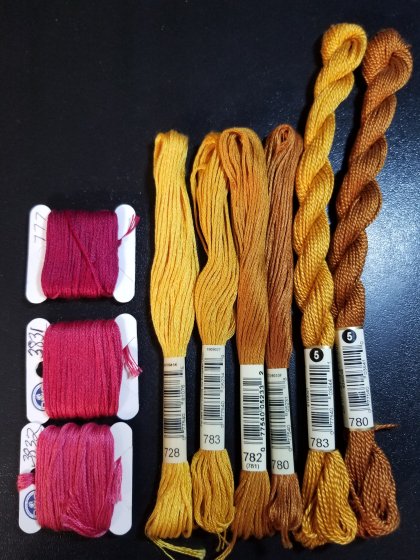 One of the counted projects is ANG’s Stitch of the Month (SOTM) from 1999, Barbara’s Patchwork. I selected threads that DMC calls Topaz (Color A) and Raspberry (Color B). We need each in light, medium, and dark values. I got an extra value of Topaz just because I might want it. We’re getting instructions each month. So, I’ll wait and see if I want to add a Kreinik for some sparkle. This will be a 5″ x 5″ design area.