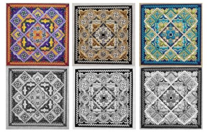 The second counted project that 8 people signed up for is my design (6″ x 6″), Crescent Journey. Linda stitched a “Neutral” colorway as she proofread what I wrote up for directions as I stitched a “Beach” colorway. It’s a 43-page booklet with about 60 diagrams. Now, these folks are my first pilot class! One of the most interesting things we learned from this piece is how different values in different areas of the piece make the focal point change. The grayscale really helps show this. I’m excited to see how everyone’s choices of colors work. At least 3 people are changing some or all the threads. This too is a monthly project. I divided it into 12 parts.