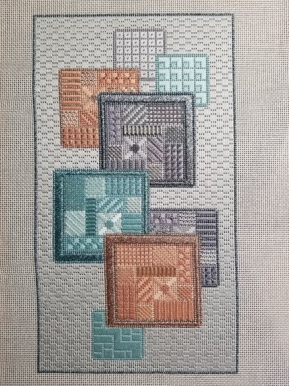 Step 2 instructions were included when Step 1 was returned to me and I am already planning what stitch goes where in the assigned geometric design. My analogous colorway with DMC floss has been determined. Color placement is tough. While I am anxious to get started, I am not in a rush as I have until May. And, there is a painted canvas that I must finish first.