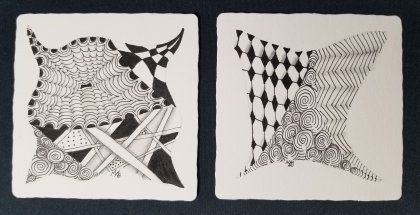 Mindy Shapiro, a certified Zentangle teacher, provided a Micron 01 pen, a Micron 08 pen, a short pencil, a smudge stick (Pro Art Stump No. 2), and 4 cards (3.5″ x 3.5″ heavy stock with wavy edges and curved corners from Zentangle.com). There are no erasers because whatever happens is meant to be.
