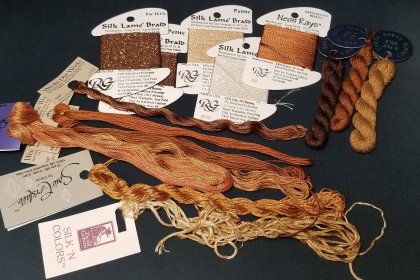 I have tagged several stitches that I really like because they are new to me. That gave me more than enough without using her stitch diagrams. I went into my stash and found some wonderful browns for use on a Sandstone canvas. After opening the overdyed Waterlilies, I changed my mind about using it because there was a large dull grayish section along the thread. I found a Wildflowers in my stash with a splash of green that might be good.
