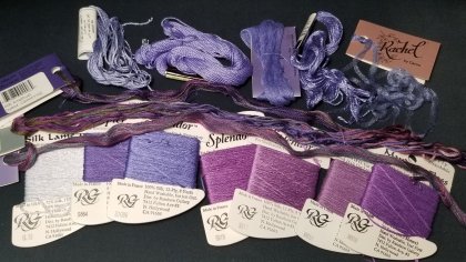 I also have a lovely purple Waterlilies overdyed thread and a card of Regal Purples Splendor Design Collection calling to me too (second design?). But, after looking for more threads to go with the Amethyst, I saw quite a range of colors causing me to abandon the Regal Purples and go towards blue-violet and red-violets. And, I found a partial Waterflowers Fushia that is looking really good with these threads too. The Amethyst has some large sections of rather dull grayish sections but maybe I just need to try the thread with certain stitches. Carolyn shares some thoughts about threads and stitches in Lesson 1 but more on that topic is coming next month.